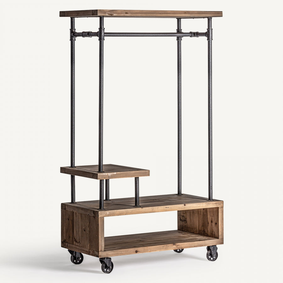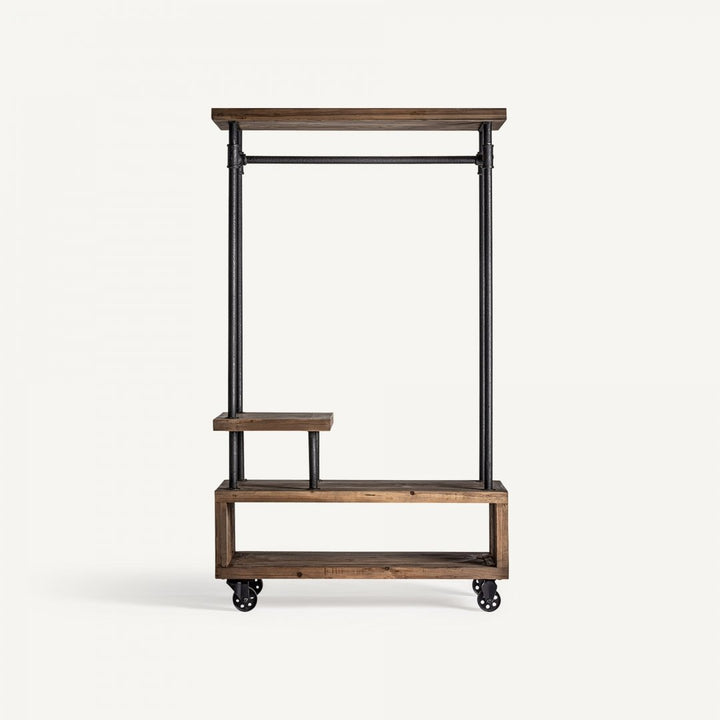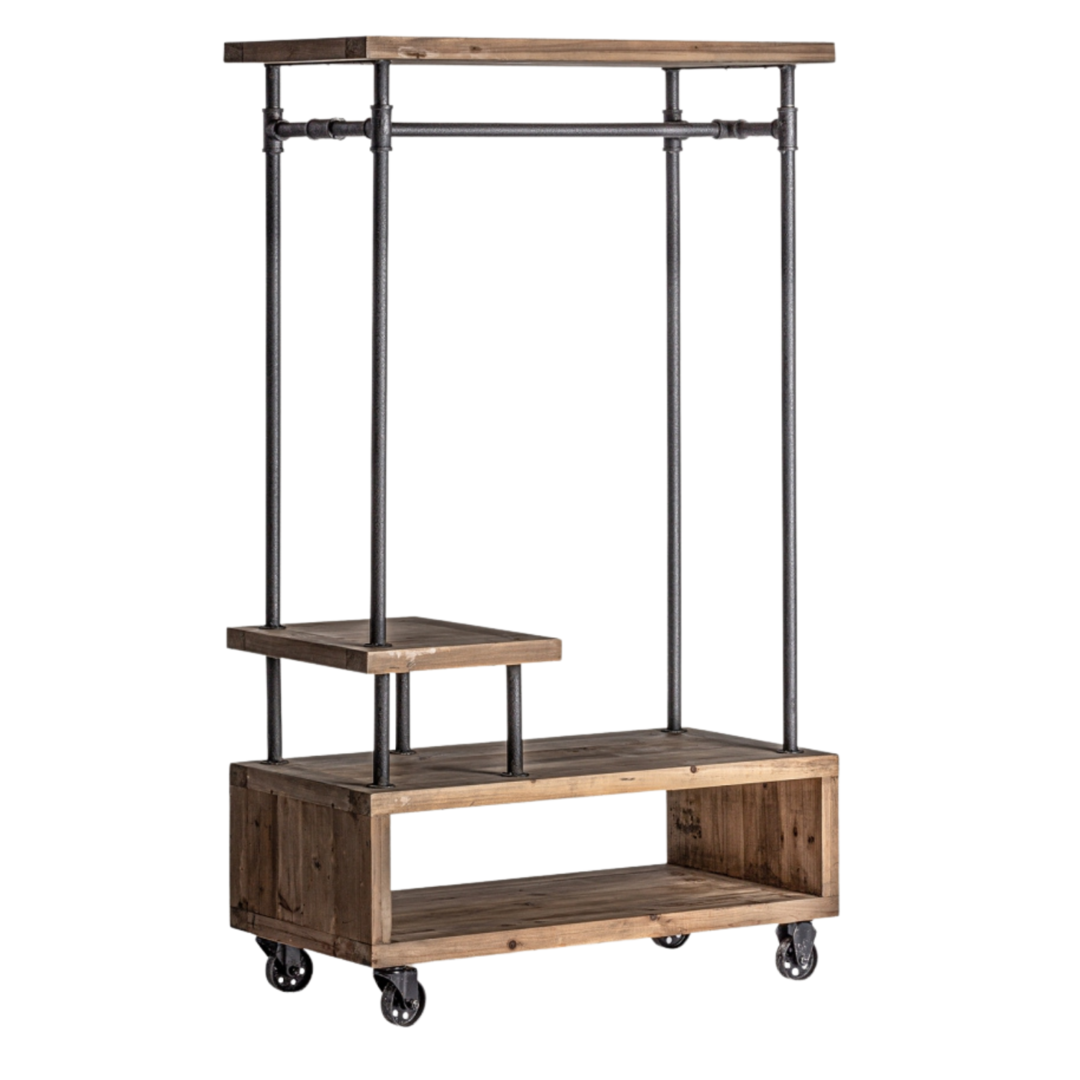Lo stile industriale combina robustezza e design urbano, rendendo questo appendiabiti in ferro e legno di olmo una scelta perfetta per ambienti moderni. Caratterizzato da una struttura solida con finitura in nero invecchiato, è dotato di due ripiani fissi e un tubo resistente per appendere abbigliamento pesante. Le pratiche ruote ne facilitano lo spostamento, aggiungendo funzionalità alla sua estetica minimalista. Supporta fino a 50 kg per ripiano, offrendo ampio spazio per indumenti e accessori. Ideale per chi cerca un appendiabiti che unisca stile industriale e praticità, perfetto per qualsiasi spazio dal design contemporaneo.