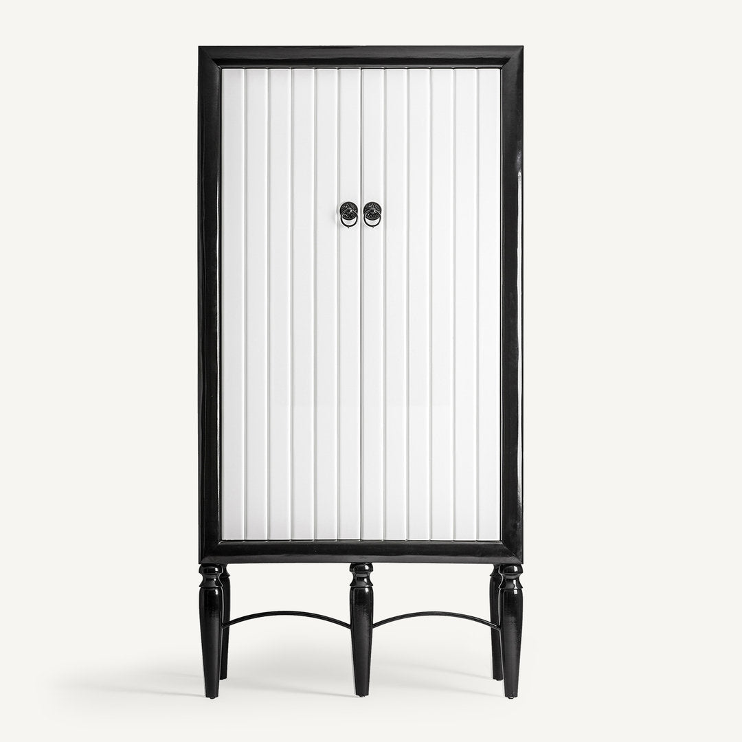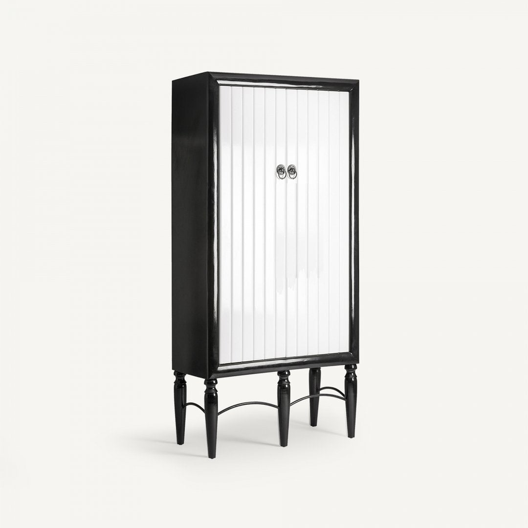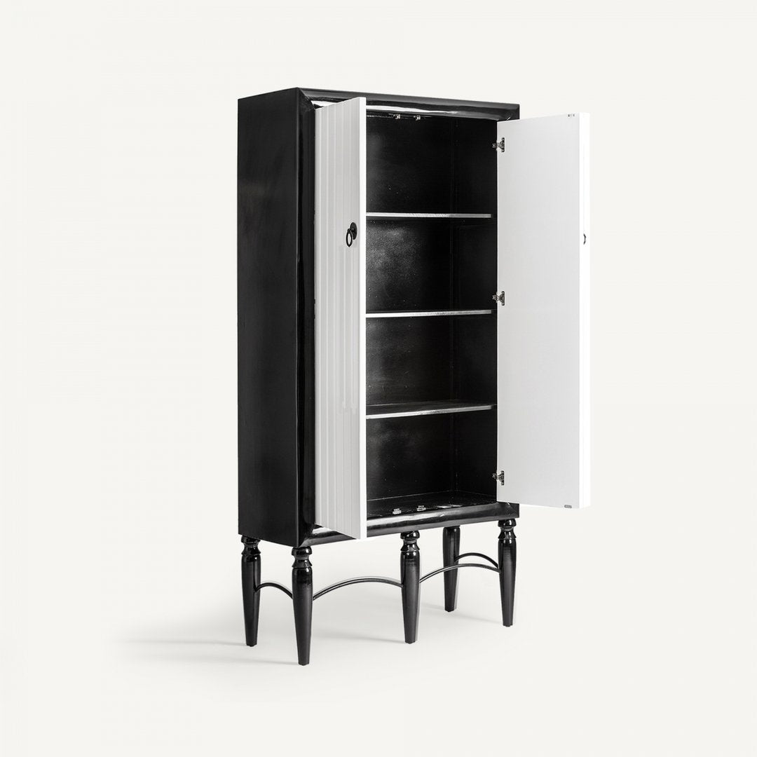 Unendo il fascino del design Art Déco con un tocco contemporaneo, questo armadio in legno di mindi bianco e nero è ideale per interni moderni. La combinazione di colori dona eleganza, mentre la solida struttura offre ampio spazio di stoccaggio con quattro ripiani interni, perfetti per organizzare gli oggetti. Le robuste gambe, elevate e ben rifinite, garantiscono stabilità e aggiungono un tocco sofisticato. Questo armadio non è solo funzionale ma rappresenta un pezzo d’arredo che arricchisce lo spazio con stile e raffinatezza, combinando tradizione e modernità in un design distintivo.
