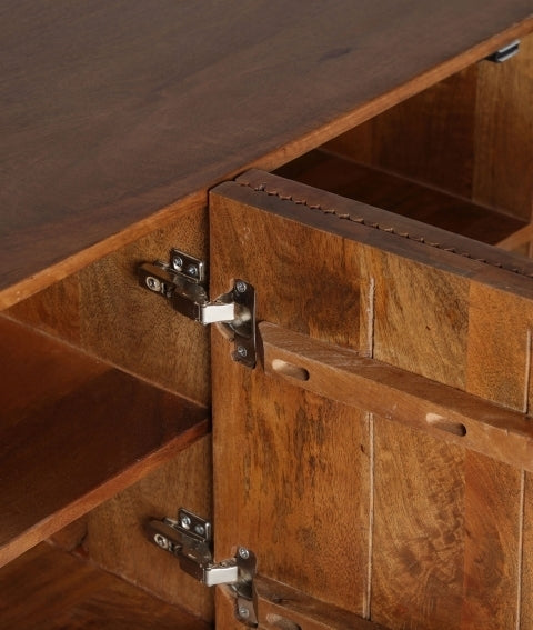 NOTE: Mango massello, travertino, 4 ante, 2 cassetti, mensole 10 kg, peso 60 kg, prodotto artigianale.