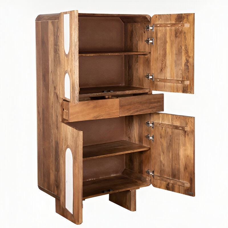 Lo stile etnico chic unisce materiali naturali e design esotico, perfetto per creare atmosfere calde e sofisticate in soggiorni o camere da letto dal gusto luxury. L’armadio etnico chic con inserti in marmo è realizzato in legno massello di mango con travertino, materiali che garantiscono robustezza e un’estetica unica. Con misure di cm 81 x 40 x H 142 e peso di 60 kg, presenta quattro ante che si aprono su due cassetti interni (31 x 29 x 12 cm) e vani (76 x 36 x 47 cm) con mensole fisse (23 cm altezza, max 10 kg ciascuna), ideale per accessori, documenti o decorazioni. Ogni elemento è artigianale per un fascino irripetibile. Perfetto per ambienti chic, aggiunge archiviazione e raffinatezza. Proposto con sconti fino al 70% su Ethnic Chic.