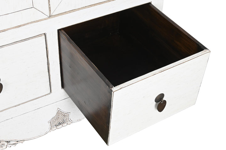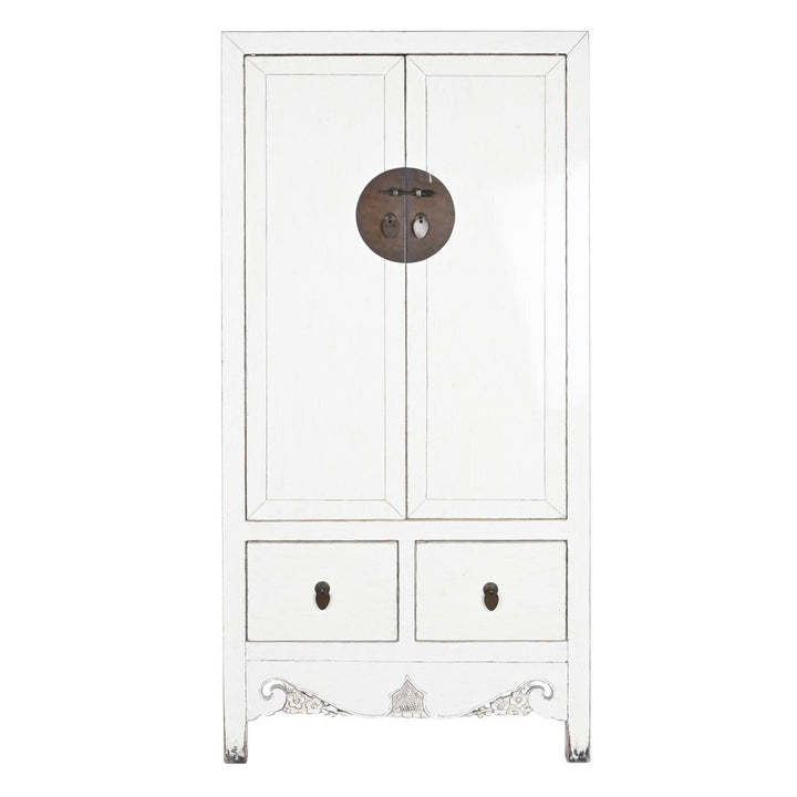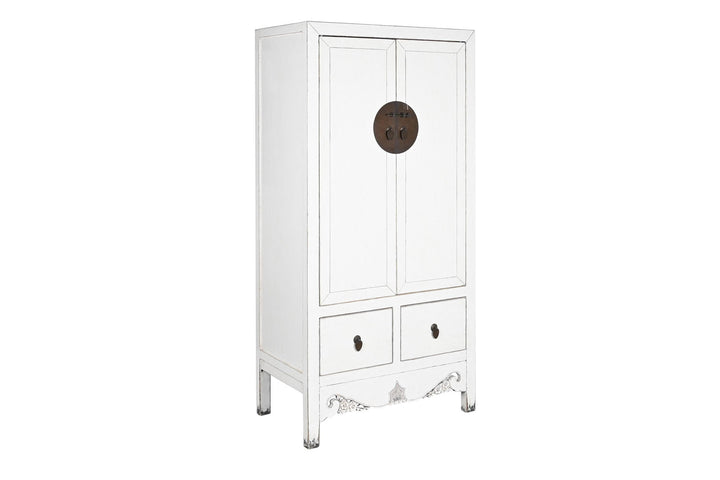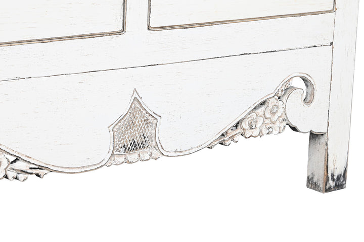 Questo elegante armadio orientale bianco shabby combina il fascino dell'oriente con il carattere raffinato dello stile shabby chic. Realizzato in legno massello di olmo e ottone anticato, garantisce resistenza e durata. Con dimensioni di 88 x 52 x H 180 cm e un peso di 56 kg, è perfetto per qualsiasi ambiente, aggiungendo un tocco di eleganza e calma. Dispone di due cassetti spaziosi e due porte per un ampio spazio di archiviazione. Le due mensole regolabili offrono versatilità, permettendo di personalizzare l'interno. Gli elementi orientali nel design, con decorazioni delicate, catturano l'essenza dell'arte orientale. Questo armadio è una scelta ideale per chi cerca mobili orientali vendita online, portando un pezzo unico nella propria casa e creando un'atmosfera accogliente e alla moda.