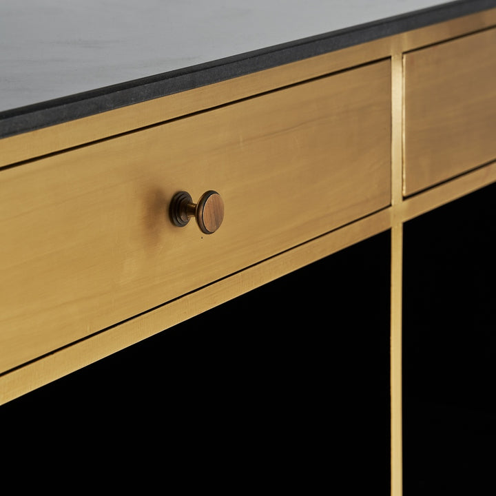 NOTE: Marmo nero gaspeado, ottone dorato, cassetti con guide in legno, piedini regolabili, peso 405,6 kg, pulizia delicata (no acidi su marmo).