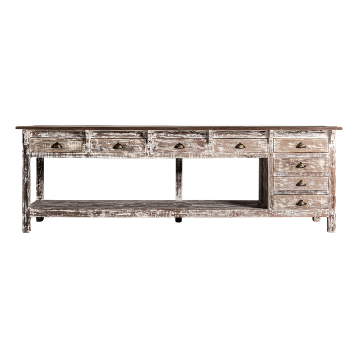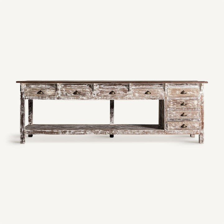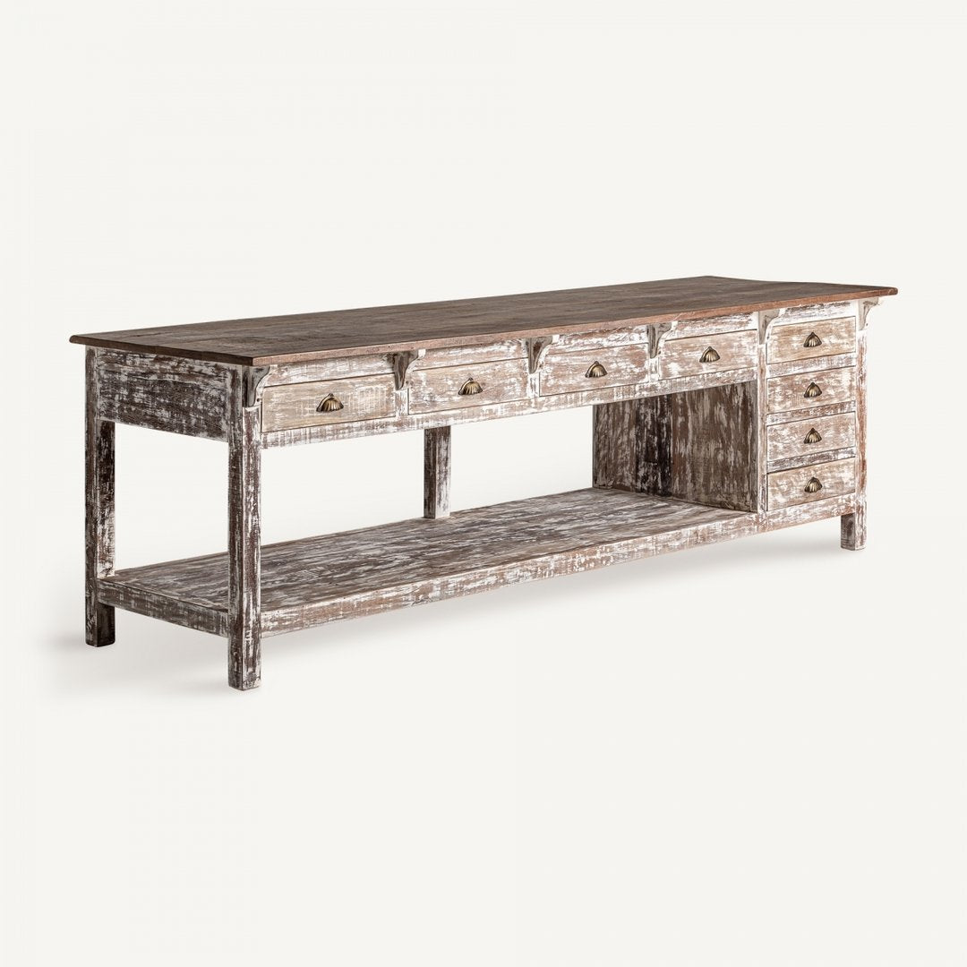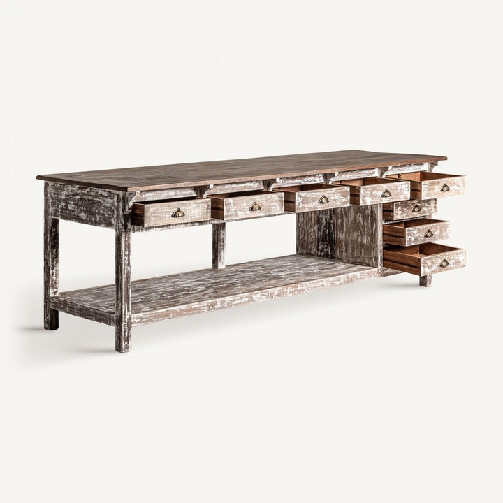 Il bancone da lavoro rustico country è l'ideale per aggiungere un tocco di autenticità e funzionalità a masserie e bistrot. Realizzato in legno massiccio tropicale, questo pezzo unico è frutto di una fabbricazione artigianale che valorizza le naturali variazioni di tonalità e le imperfezioni del legno come nodi e crepe, rendendo ogni bancone esclusivo. Con dimensioni di 274 x 88 cm e un'altezza di 90 cm, questo robusto bancone pesa 205,6 kg e può supportare fino a 180 kg, rendendolo perfetto per ambienti ad alto traffico.Questo bancone offre ampio spazio di archiviazione con 8 cassetti, ciascuno misurando 43 x 37 x 9 cm, e un grande vano centrale di 203 x 70 x 44 cm. Le guide dei cassetti sono integrate direttamente nel legno, garantendo durata e praticità. Le misure delle gambe (6,5 x 6,5 x 12 cm) e la distanza tra esse (255 x 63 cm) assicurano stabilità e robustezza, mentre lo spessore del piano di 3 cm contribuisce alla solidità complessiva.