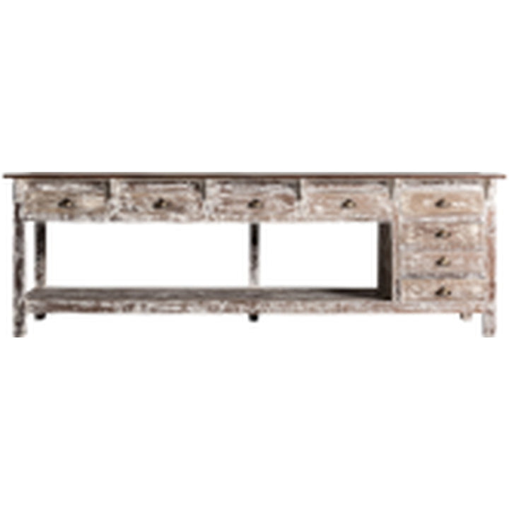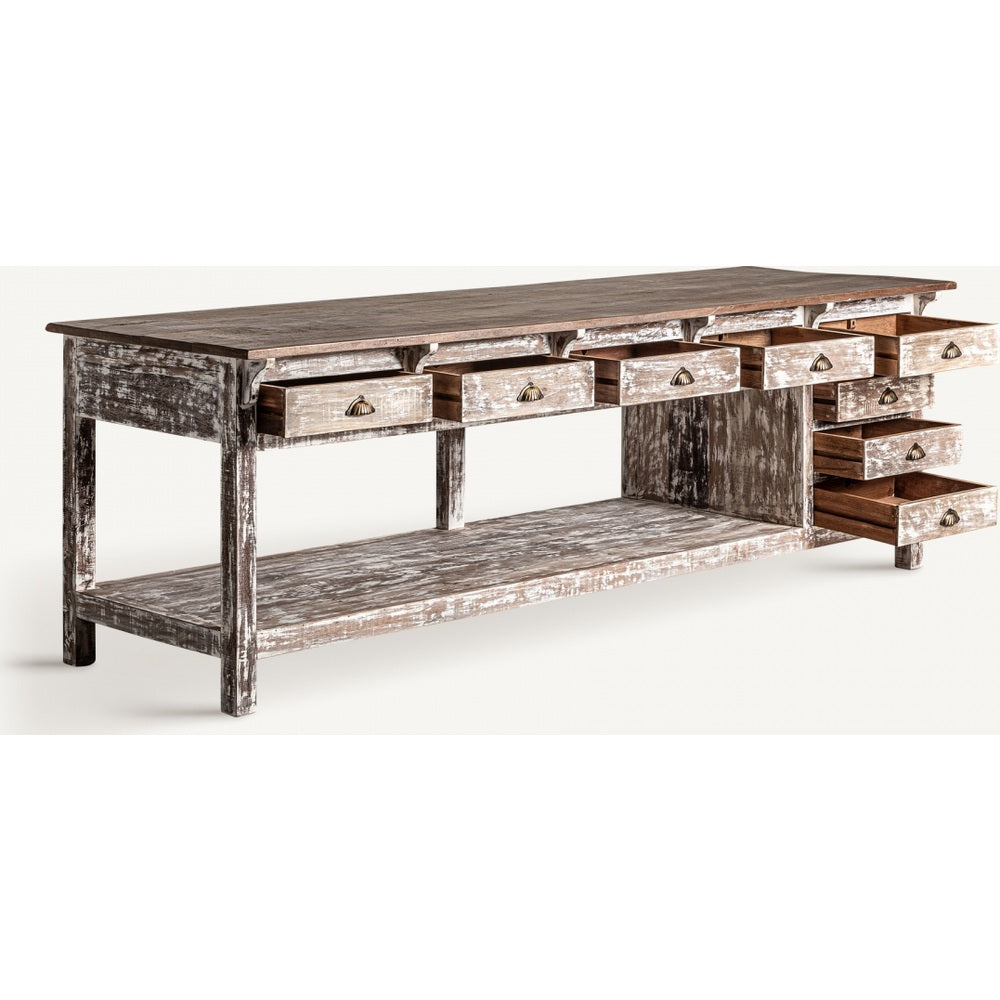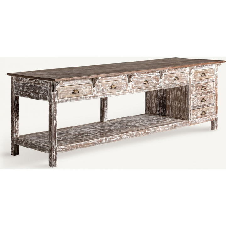 Lo stile country masseria è fieno e caffè bollente. Il Bancone da Lavoro Rustico è scolpito in legno tropicale massello, con nodi e crepe che raccontano storie. Con peso di 205,6 kg, presenta 8 cassetti 43×37×9 cm e vano centrale 203×70×44 cm. Carico 180 kg. Perfetto per bistrot, masserie e cucine pro, crea il cuore della casa. Proposto con sconti fino al 70% su Ethnic Chic.