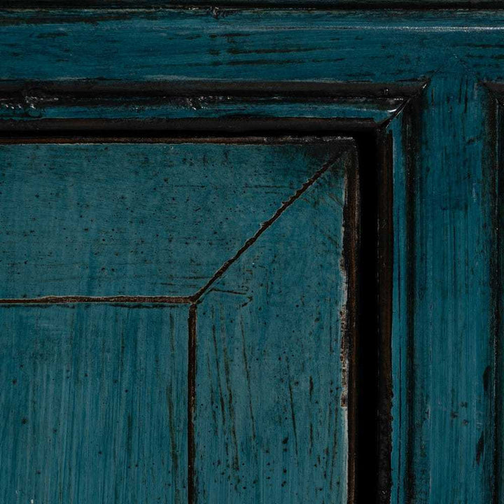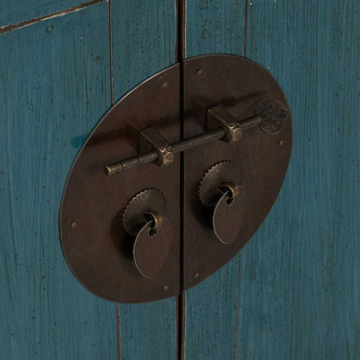 Un mobile dallo stile orientale in una tonalità accattivante di blu con finiture anticata, il che gli conferisce un aspetto vissuto e caratteristico. Si può notare un sottile gioco di ombre che evidenzia la texture del legno e i dettagli dei pomelli e delle serrature in rame, elementi che risaltano contro il colore vivace del buffet. La composizione è semplice, con il buffet posizionato al centro su uno sfondo neutro, permettendo al prodotto di essere il protagonista indiscusso dell'immagine.Un pezzo maestro di arredo di design, il Buffet cinese orientale blu rappresenta una scelta raffinata per chi cerca un connubio tra tradizione e modernità. L'artigianato di qualità e lo stile intramontabile si coniugano nella solida struttura in legno massello di pino riciclato, espressione di sostenibilità e durevolezza. Le tonalità di blu vivide ma elegantemente consumate donano a ogni ambiente un tocco di carisma senza tempo, adattandosi perfettamente sia a interni classici che a quelli più contemporanei. I dettagli in rame dei manici aggiungono un ulteriore livello di finezza. Pratico per la conservazione grazie alle sue ampie dimensioni di 140 x 40 x H 85 cm, questo buffet cinese è dotato di diverse ante e cassetti per un'organizzazione ottimale degli spazi. Il suo stile esclusivo e la funzionalità lo rendono ideale per chi desidera un mobile dal forte impatto estetico e dalla grande capacità.