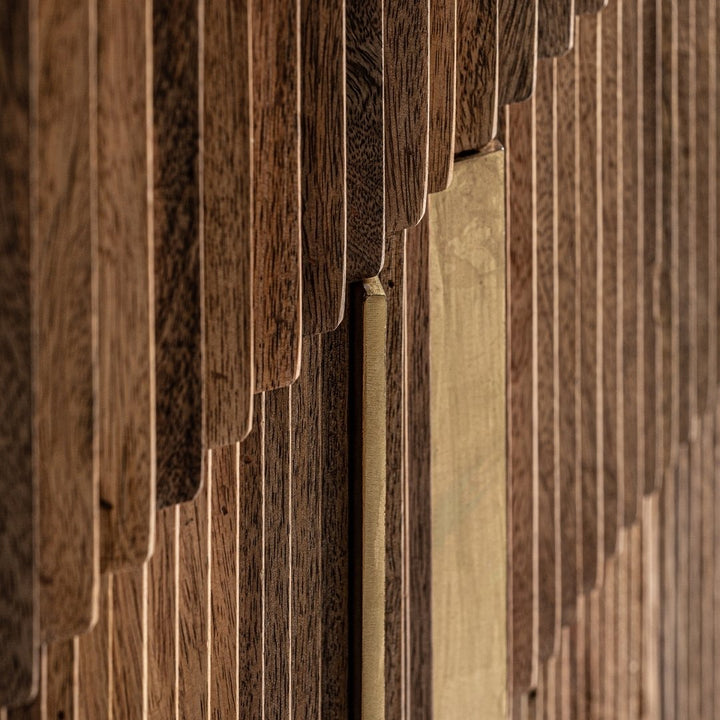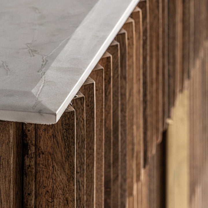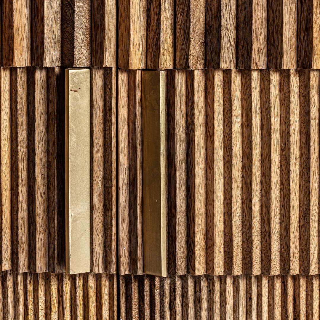 Lo stile raffinato Art Deco è caratterizzato su questo buffet da linee eleganti e design plissettato. Realizzato in legno di mango e combinato con marmo, questo pezzo fatto a mano presenta variazioni di tono, dimensione e forma che lo rendono unico. Le superfici verticali scanalate aggiungono profondità e dinamismo visivo, mentre il colore marrone e bianco conferisce un aspetto sofisticato e versatile. Con dimensioni di 180 x 43 x 82 cm e un peso di 110,2 kg, il buffet è dotato di quattro porte e un ripiano fisso, offrendo ampio spazio di archiviazione. Le gambe in legno e il marmo bianco venato aggiungono un tocco di eleganza. Questo mobile si integra perfettamente in ambienti moderni, rustici e scandinavi, ideale per soggiorni, sale da pranzo e ingressi, fungendo da punto focale grazie alla sua estetica distintiva e alla sua funzionalità. Perfetto per chi cerca un buffet elegante e di grande impatto visivo.