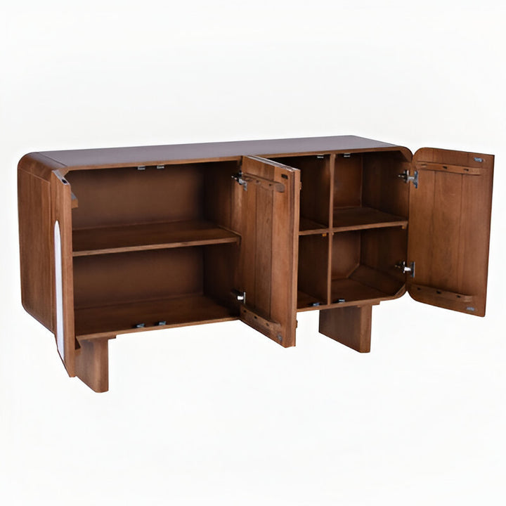 Lo stile etnico chic si distingue per la sua capacità di mescolare materiali naturali con un design che richiama culture e tradizioni di diverse parti del mondo. Questo stile è ideale per chi cerca un arredamento che aggiunga un tocco esotico e caldo agli spazi, utilizzando materiali come il legno massello e la pietra naturale. Questo buffet, realizzato in legno di mango combinato con travertino e legno MDF, è un pezzo artigianale con dettagli raffinati come le ante intarsiate. Con il suo colore marrone e bianco, si adatta perfettamente a un arredamento contemporaneo. Il mobile dispone di 4 ante che racchiudono due ampi vani con mensole fisse. Ogni vano ha dimensioni interne di 68 x 32 x 56 cm e uno spazio tra le mensole di 2 cm, con una capacità di carico per mensola di 10 kg. Il peso complessivo del buffet è di 53,6 kg, garantendo una struttura stabile e robusta. Le gambe, misurando 5 x 36 x 21 cm, conferiscono elevazione e leggerezza visiva al mobile, con una distanza tra di esse di 104 cm. Perfetto per chi cerca un buffet etnico online che unisca funzionalità e stile, questo pezzo arricchisce qualsiasi spazio abitativo con un tocco di eleganza esotica.