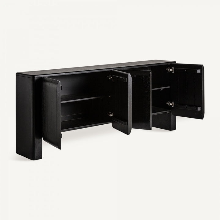 Lascia che il buffet nero definisca il tuo spazio con la sua eleganza. Scolpito in legno di mango e rifinito in nero, questo pezzo trasuda raffinatezza e stile. Il suo design minimalista e contemporaneo fa sì che il buffet nero moderno sia al centro dell'attenzione in ogni ambiente. Con dimensioni di 190 x 40 x 81 cm e un peso di 79,9 kg, offre ampio spazio di archiviazione per tutte le vostre esigenze, grazie alle sue quattro porte e ripiani interni regolabili. Fatto a mano, ogni pezzo presenta variazioni di tono, dimensione e forma, rendendolo unico. Le gambe con tacchi regolabili assicurano stabilità su ogni superficie. Questo buffet etnico contemporaneo è perfetto per soggiorni, ingressi e sale da pranzo, bilanciando forma e funzione con eleganza.