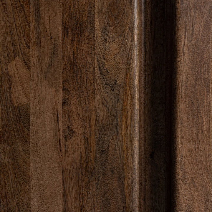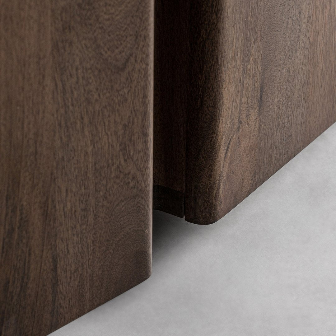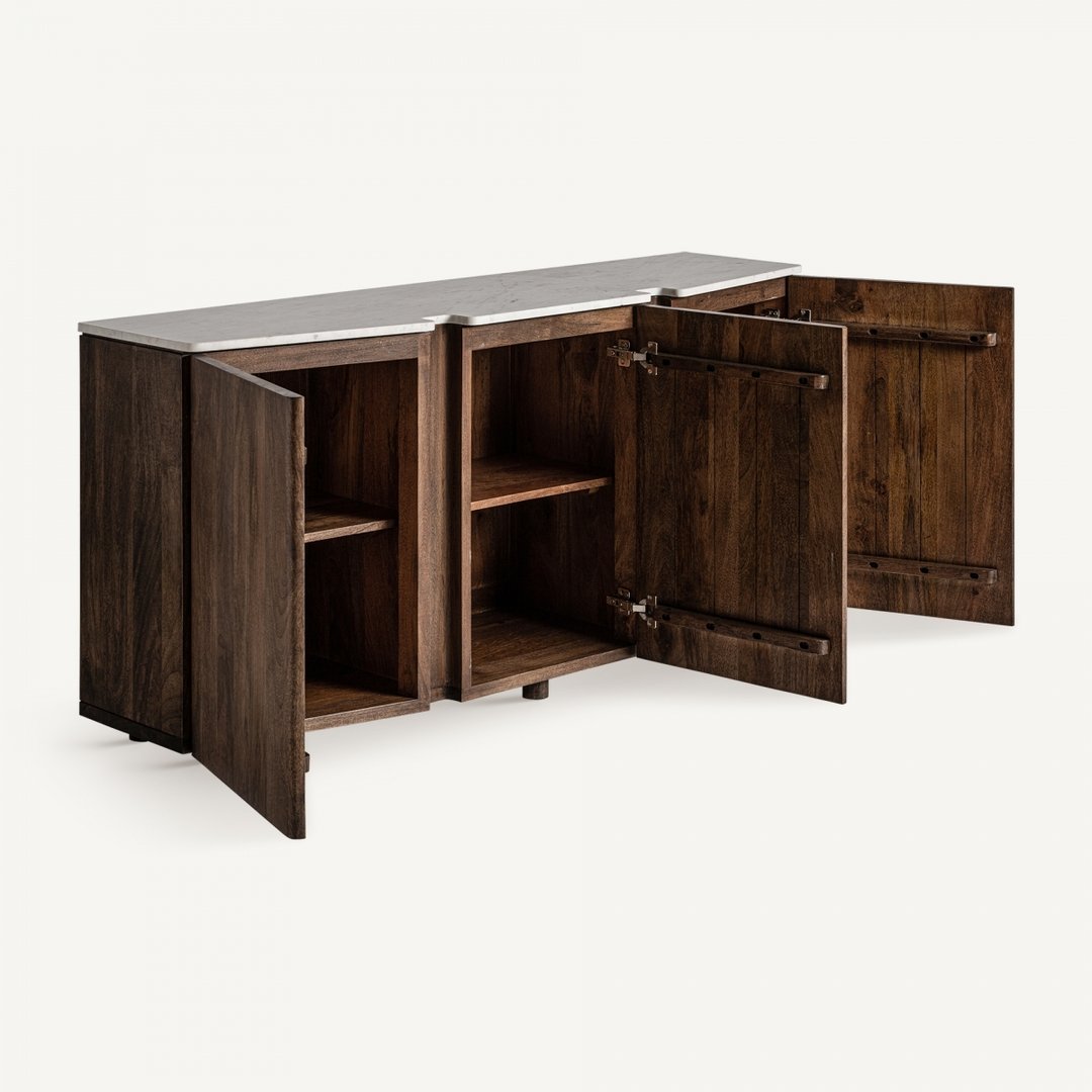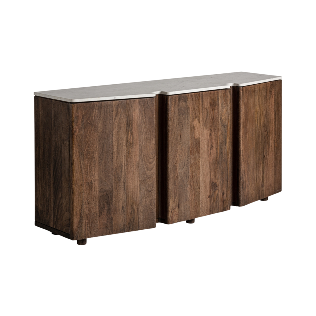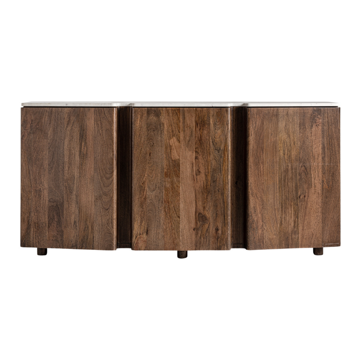 Lo stile minimal chic combina semplicità ed eleganza con una forte attenzione ai dettagli e ai materiali di alta qualità. Questo stile si distingue per le linee pulite e l'aspetto sobrio, che creano un'estetica moderna e raffinata. La scelta del legno massello conferisce un senso di calore e naturalezza, mentre le superfici lisce e i bordi arrotondati aggiungono un tocco di modernità. Evidenziando la solidità e la bellezza del legno di mango, questo buffet è una testimonianza di artigianato e design.  Le sue massicce ante in una tonalità marrone intenso offrono una dichiarazione di robustezza, mentre l'aggiunta del marmo aggiunge un tocco sofisticato.Con dimensioni di 160 x 45 x 75 cm e un peso di 98,4 kg, questo mobile fatto a mano offre tre porte e un ripiano regolabile. Le gambe di 5x5x5 cm con tacchi regolabili garantiscono stabilità. Ideale per soggiorni e sale da pranzo, il suo design minimalista chic permette di inserirsi armoniosamente in diversi contesti. Include ancoraggio a parete per maggiore sicurezza.