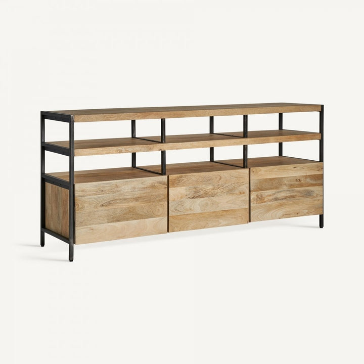 Lo stile industrial chic si caratterizza per l'uso di materiali grezzi e finiture semplici, combinando legno naturale e metallo per creare un look che è allo stesso tempo robusto e raffinato. Le linee pulite e la struttura aperta in metallo nero, insieme alle superfici in legno di mango, conferiscono al mobile un aspetto contemporaneo e funzionale. Il legno conserva le sue venature naturali, che aggiungono calore e texture all'aspetto generale del mobile, mentre il metallo nero offre un contrasto moderno e elegante. Questo stile industriale chic è ideale per ambienti che cercano di combinare elementi rustici con un design moderno e urbano. È perfetto per loft, studi, uffici domestici, o qualsiasi spazio che desideri un tocco di carattere industriale senza sacrificare l'eleganza.  Questo buffet è una testimonianza del moderno design industriale. Realizzato con legno di mango e dettagli in ferro, unisce il calore del legno naturale alla robustezza del metallo. Dimensioni di 170 x 43 x 76 cm, peso di 54 kg, tre porte e sei vani superiori di 54 x 43 x 13 cm. Le gambe in ferro con tacchi regolabili. Ideale per chi cerca un buffet in stile industriale che dia carattere, funzionalità e stile al proprio spazio. Perfetto per un ambiente moderno dal tocco industriale, è adatto a soggiorni, uffici e spazi open-concept.