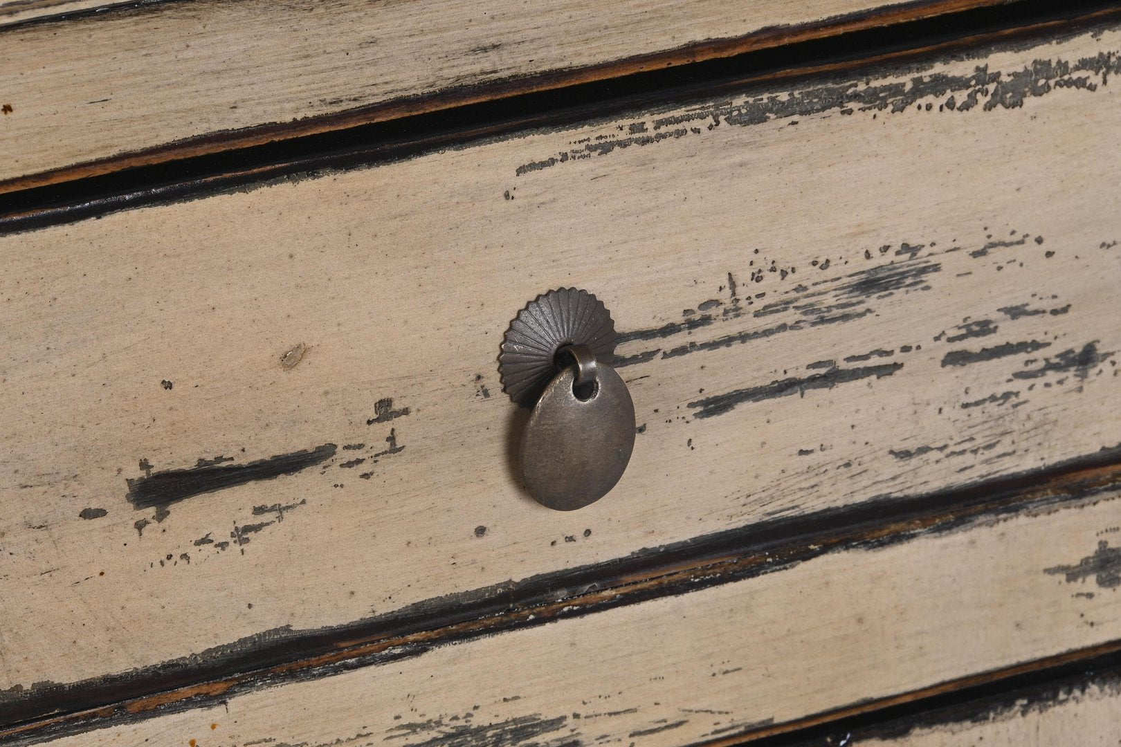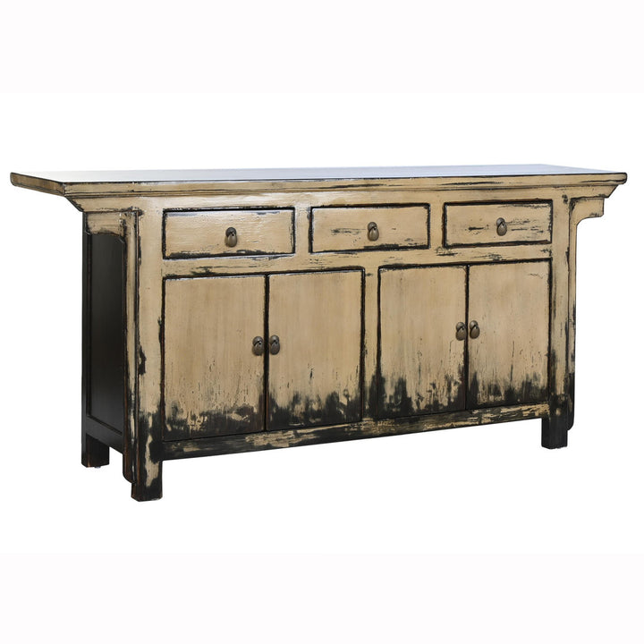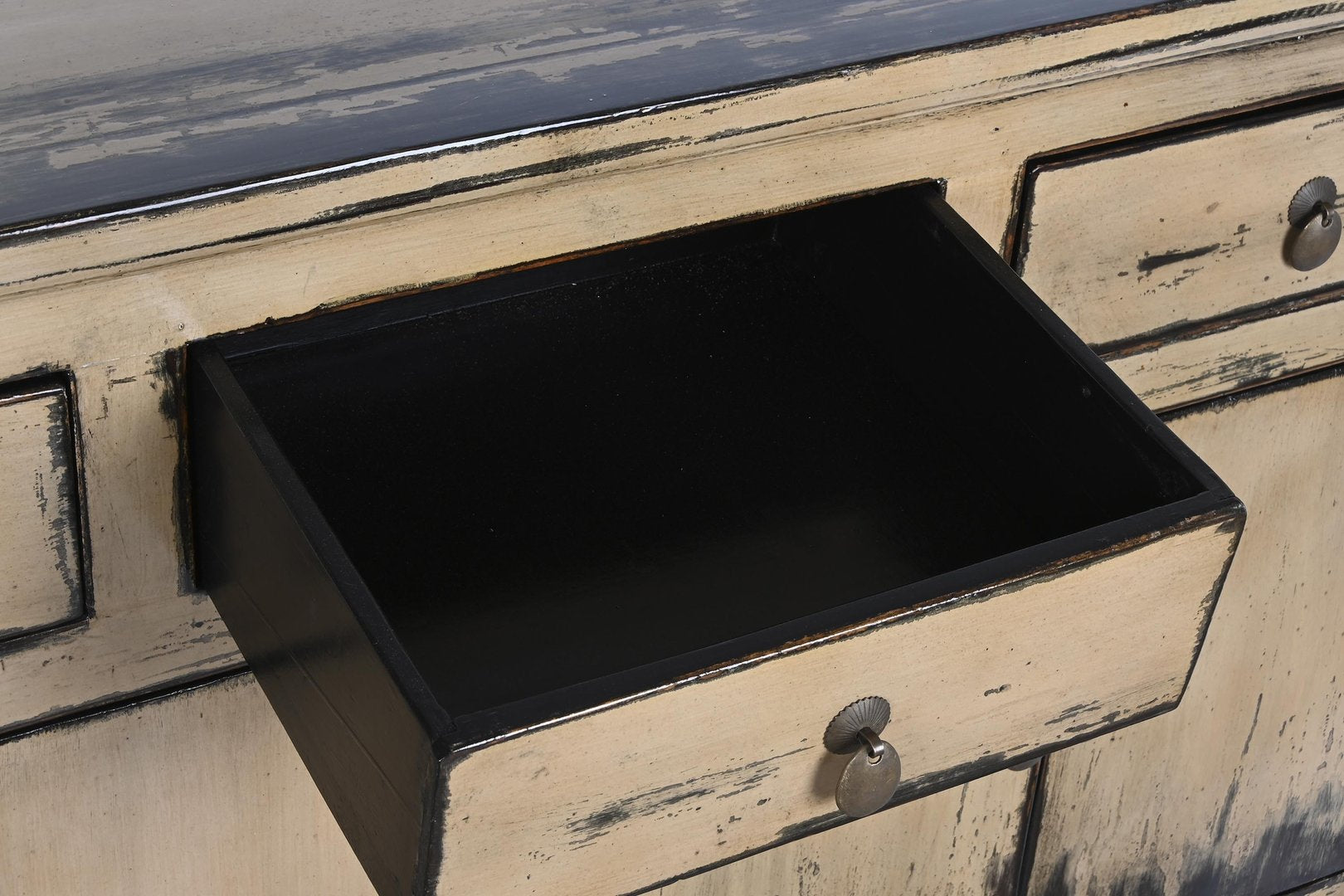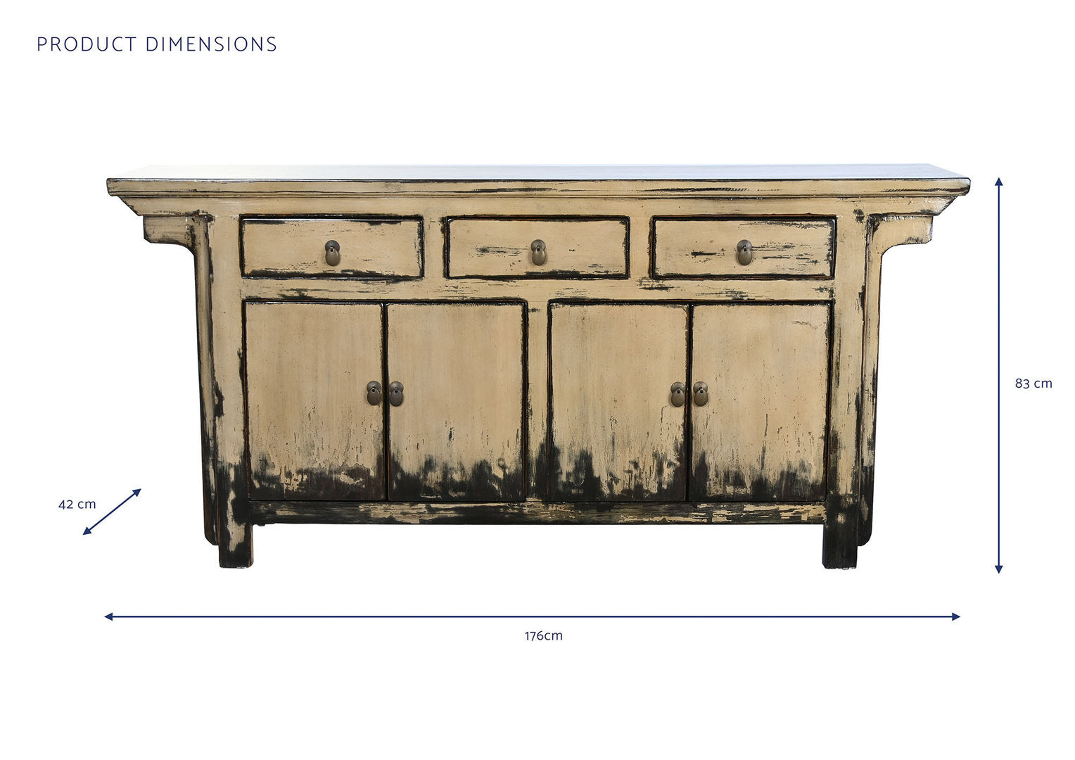 Meraviglioso design rustico o shabby chic, noto per la sua finitura deliberatamente invecchiata e consumata che dona carattere e un aspetto vissuto. Le dimensioni indicate sono 176 cm di larghezza, 42 cm di profondità e 83 cm di altezza. La colorazione è in un tono crema o avorio con segni di usura neri che evidenziano bordi e dettagli, caratteristica dello stile shabby chic che enfatizza l'effetto anticato. Le maniglie e i dettagli delle cerniere sono in metallo, aggiungendo un contrasto di materiale al legno. Lo stile generale del mobile è rustico e vintage, con un aspetto che suggerisce che il mobile potrebbe avere una storia o provenire da una casa di campagna o una bottega artigianale. È un pezzo che potrebbe essere utilizzato sia in ambienti tradizionali che in contesti più moderni per aggiungere un tocco di calore e storicità.