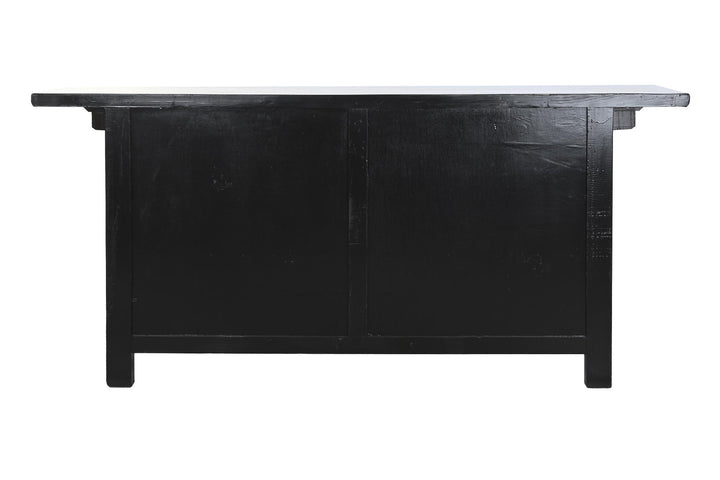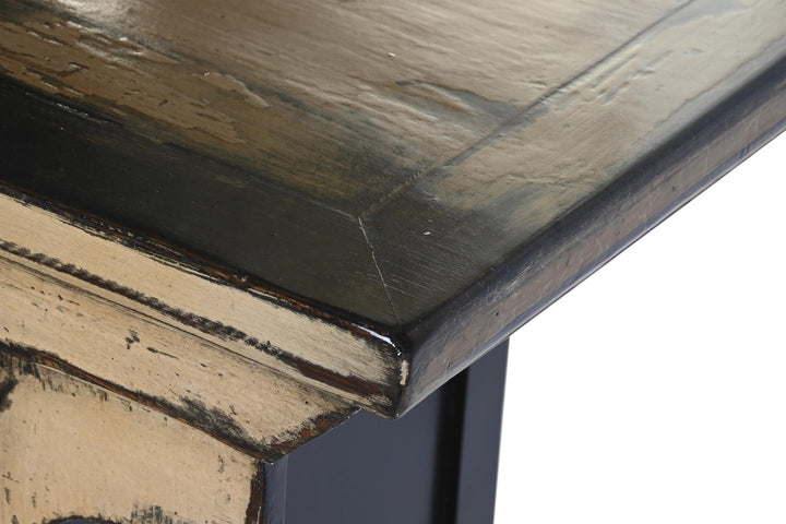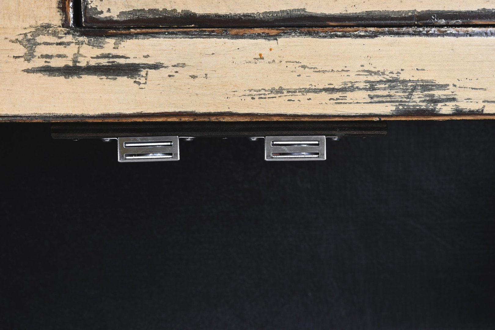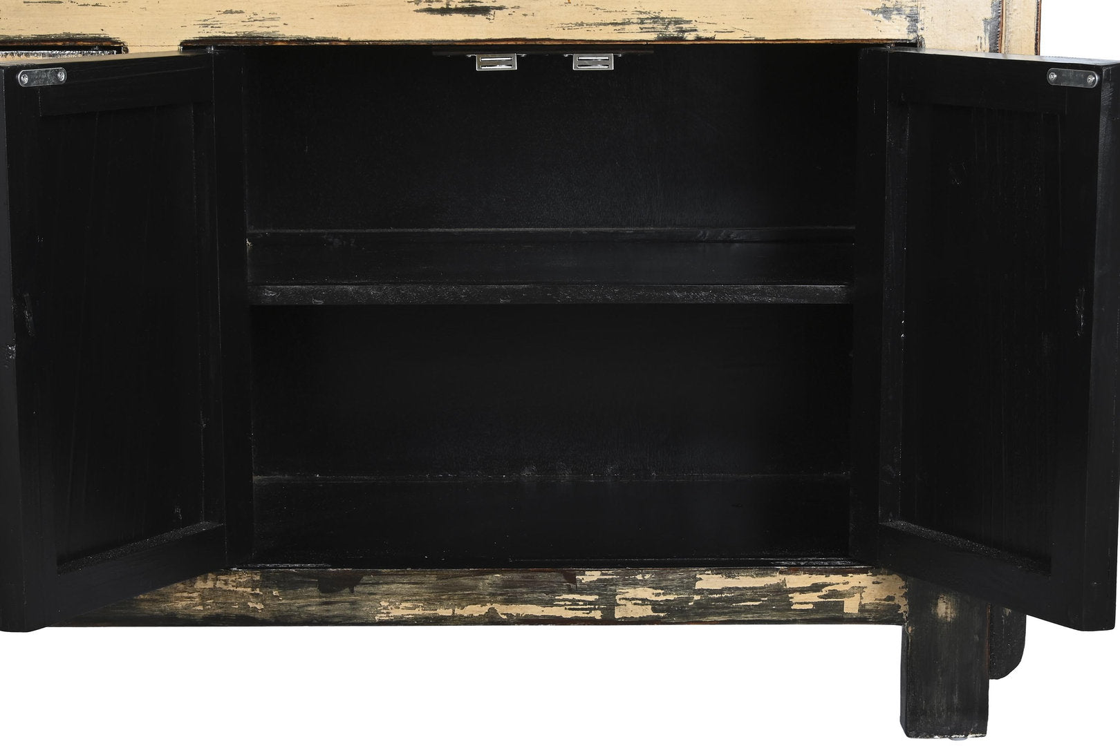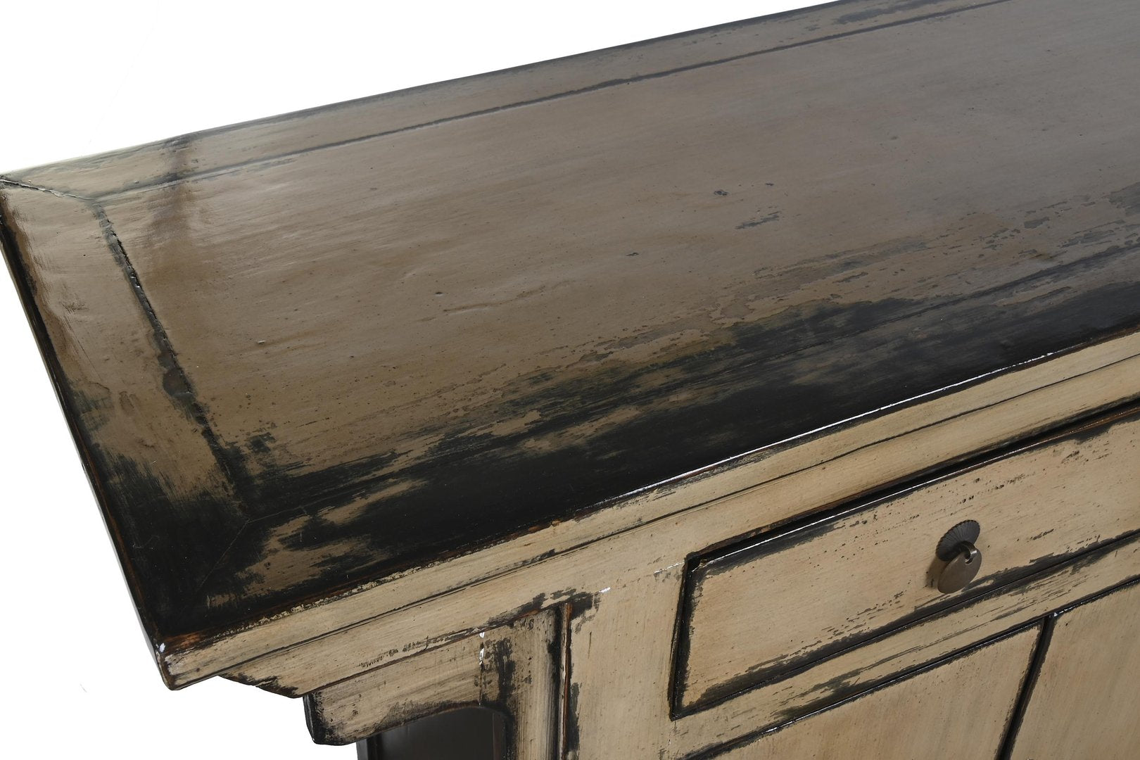 Meraviglioso design rustico o shabby chic, noto per la sua finitura deliberatamente invecchiata e consumata che dona carattere e un aspetto vissuto. Le dimensioni indicate sono 176 cm di larghezza, 42 cm di profondità e 83 cm di altezza. La colorazione è in un tono crema o avorio con segni di usura neri che evidenziano bordi e dettagli, caratteristica dello stile shabby chic che enfatizza l'effetto anticato. Le maniglie e i dettagli delle cerniere sono in metallo, aggiungendo un contrasto di materiale al legno. Lo stile generale del mobile è rustico e vintage, con un aspetto che suggerisce che il mobile potrebbe avere una storia o provenire da una casa di campagna o una bottega artigianale. È un pezzo che potrebbe essere utilizzato sia in ambienti tradizionali che in contesti più moderni per aggiungere un tocco di calore e storicità.