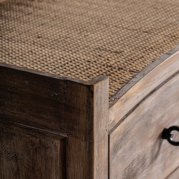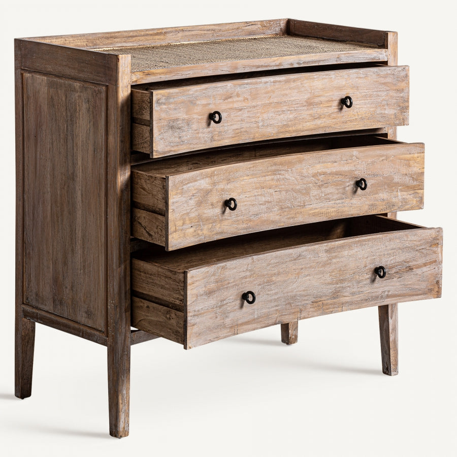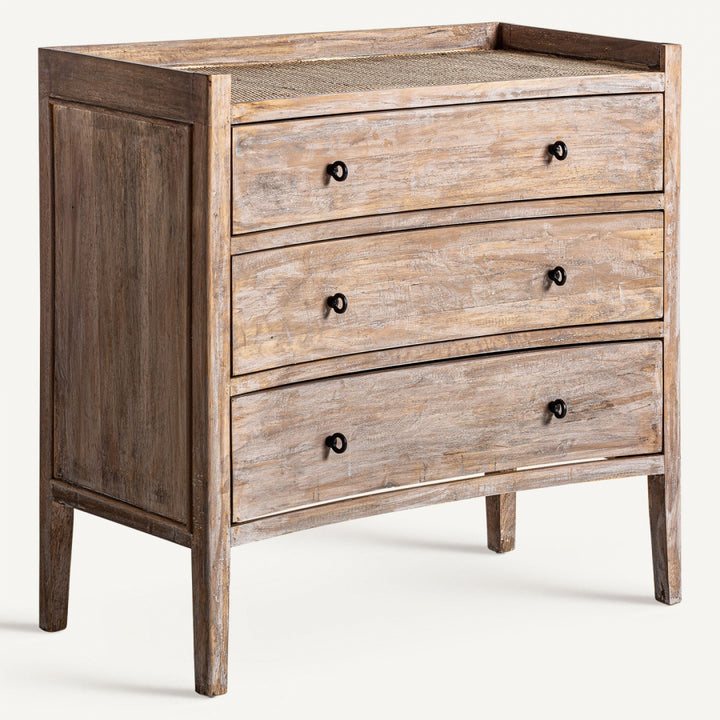 Lo stile Provenzale evoca il fascino rustico della campagna francese, unendo eleganza e materiali naturali. Questa cassettiera artigianale è realizzata in legno massello di abete combinato con rattan, una scelta che garantisce qualità e robustezza. La finitura bianco sporco invecchiato aggiunge un tocco di autenticità, perfetto per arredi provenzali o ambienti rustico chic. Dotata di tre cassetti spaziosi (interni 80x28x13 cm), offre una soluzione pratica per organizzare oggetti con stile. Dettagli unici come nodi, segni o leggere imperfezioni arricchiscono il carattere di questa cassettiera country chic, rendendola un pezzo unico. Ideale per chi cerca cassettiere provenzali, si adatta perfettamente a camere da letto, soggiorni o ingressi, aggiungendo calore e funzionalità. Questo mobile artigianale è pensato per sostenere fino a 50 kg, combinando estetica e praticità.