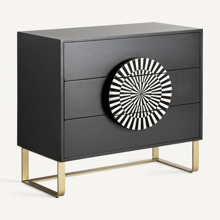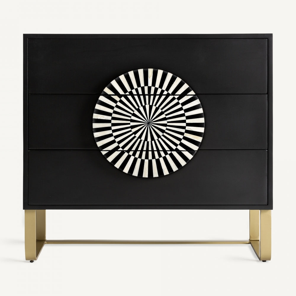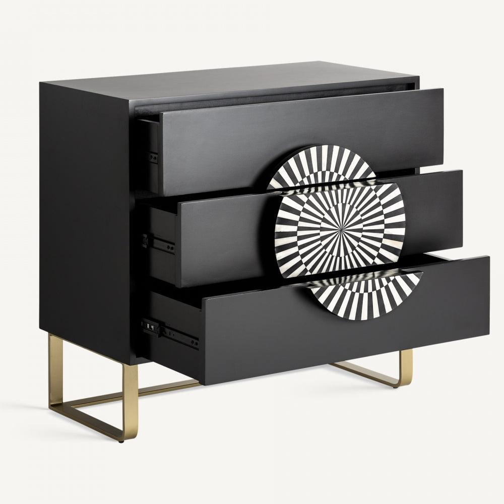 Realizzata in ferro e dettagliata in osso, la cassettiera cattura l’essenza dello stile Art Deco con il suo design bicolore in bianco e nero. Unisce eleganza e funzionalità, offrendo un ampio spazio di archiviazione con i suoi tre cassetti (80x34x14 cm). Con le sue linee pulite e i dettagli sofisticati, non è solo un mobile, ma un vero e proprio pezzo d'arte che richiama il glamour e lo splendore di un'epoca passata.
