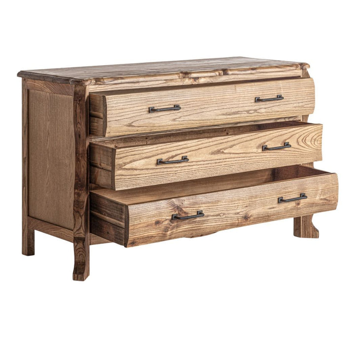 L'arredamento in stile rustico moderno combina l'eleganza della tradizione con la funzionalità contemporanea. Questo stile è perfetto per chi desidera creare un'atmosfera calda e accogliente, mantenendo al contempo un design raffinato. La cassettiera in legno di olmo è un elemento essenziale per questo tipo di arredamento. Realizzata con materiali di alta qualità, la cassettiera misura 137x53x80 cm e offre un ampio spazio di archiviazione con tre cassetti. La finitura naturale esalta la bellezza del legno, rendendo ogni pezzo unico e ricco di carattere. Questa cassettiera è ideale per chi vuole aggiungere un tocco di eleganza rustica alla propria casa.