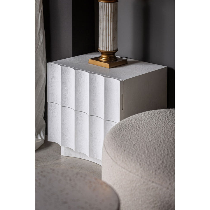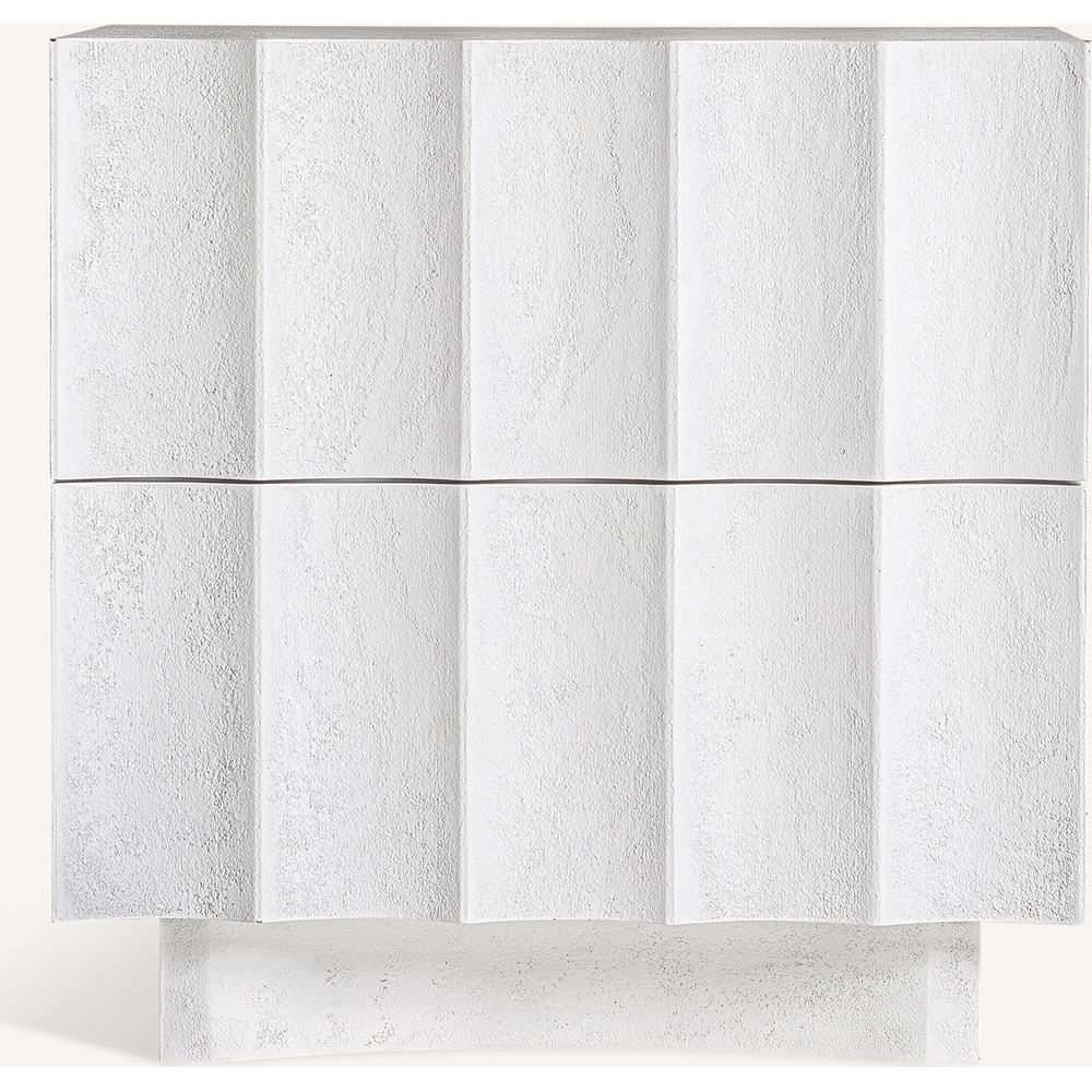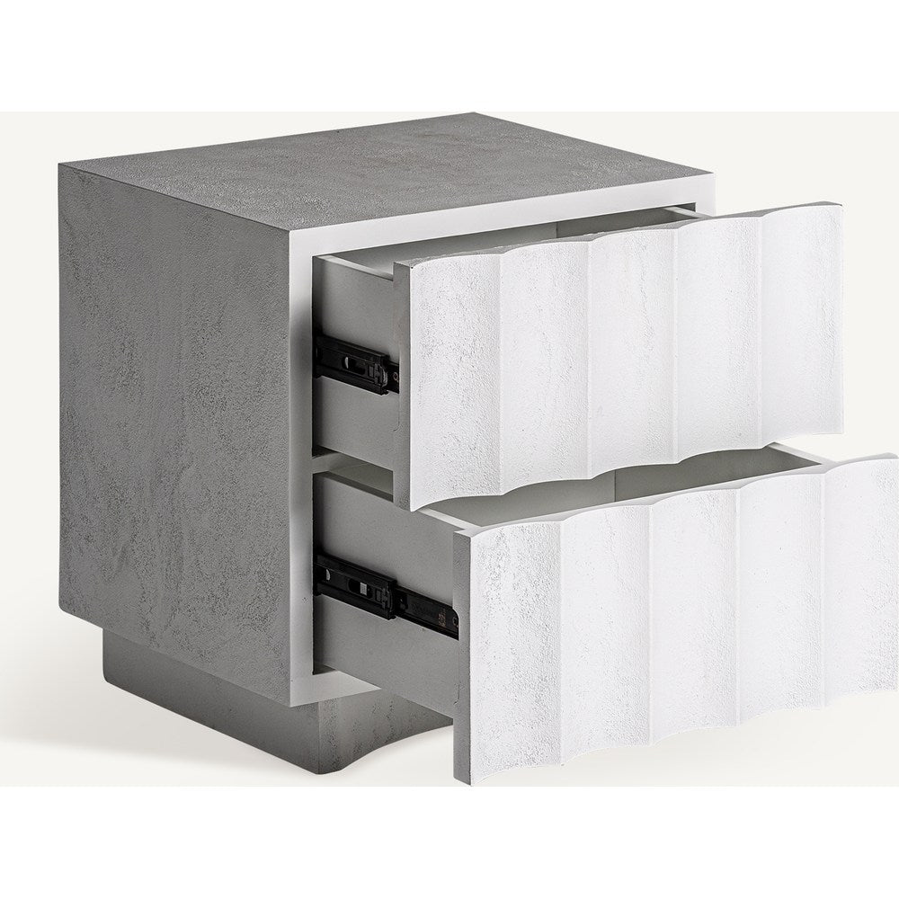NOTE: Struttura in MDF con rivestimento in resina bianca effetto usurato, 2 cassetti capienti, lavorazione artigianale, dimensioni 50×40×50 cm, finitura materica e unica.