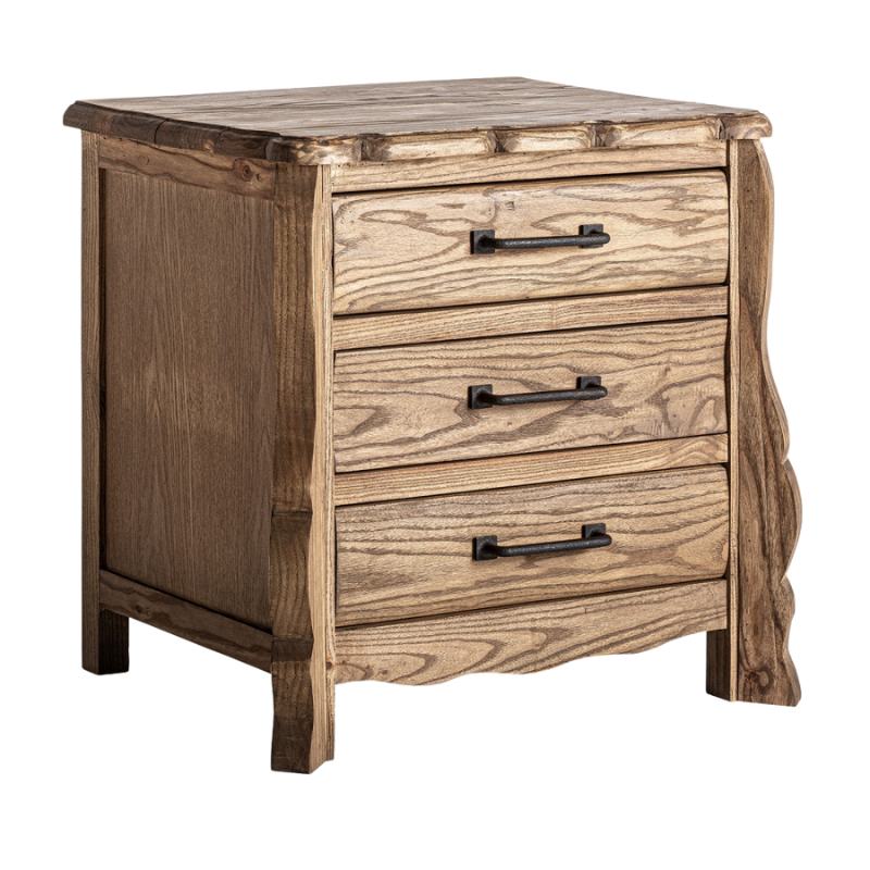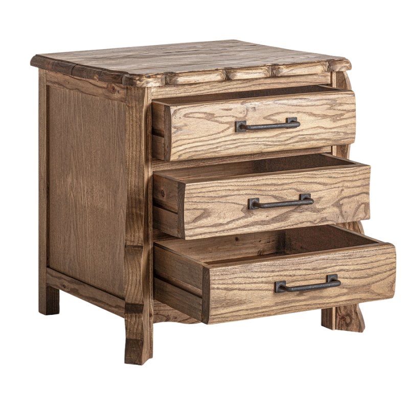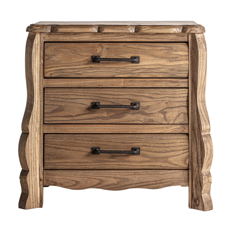 Questo elegante comodino francese chic rappresenta l'incontro perfetto tra tradizione e stile. Realizzato in pregiato legno massello di olmo e rifinito in un colore naturale, questo comodino è un tesoro di artigianato che aggiunge un tocco di lusso a qualsiasi camera da letto elegante. Con dimensioni di 64 x 47 x H 60 cm, offre un design robusto e senza tempo che valorizza l'eleganza classica. Con tre spaziosi cassetti da 44 x 32 x 10 cm, questo comodino è ideale per tenere i tuoi effetti personali in ordine. Dettagli artigianali come i cassetti con guide in legno integrate e la struttura in legno massiccio ne garantiscono la durabilità e la qualità. Con un peso di 17,4 kg e un carico massimo di 30 kg, è un complemento funzionale e decorativo. Perfetto per chi cerca mobili di pregio e lusso online che uniscono funzionalità e stile.