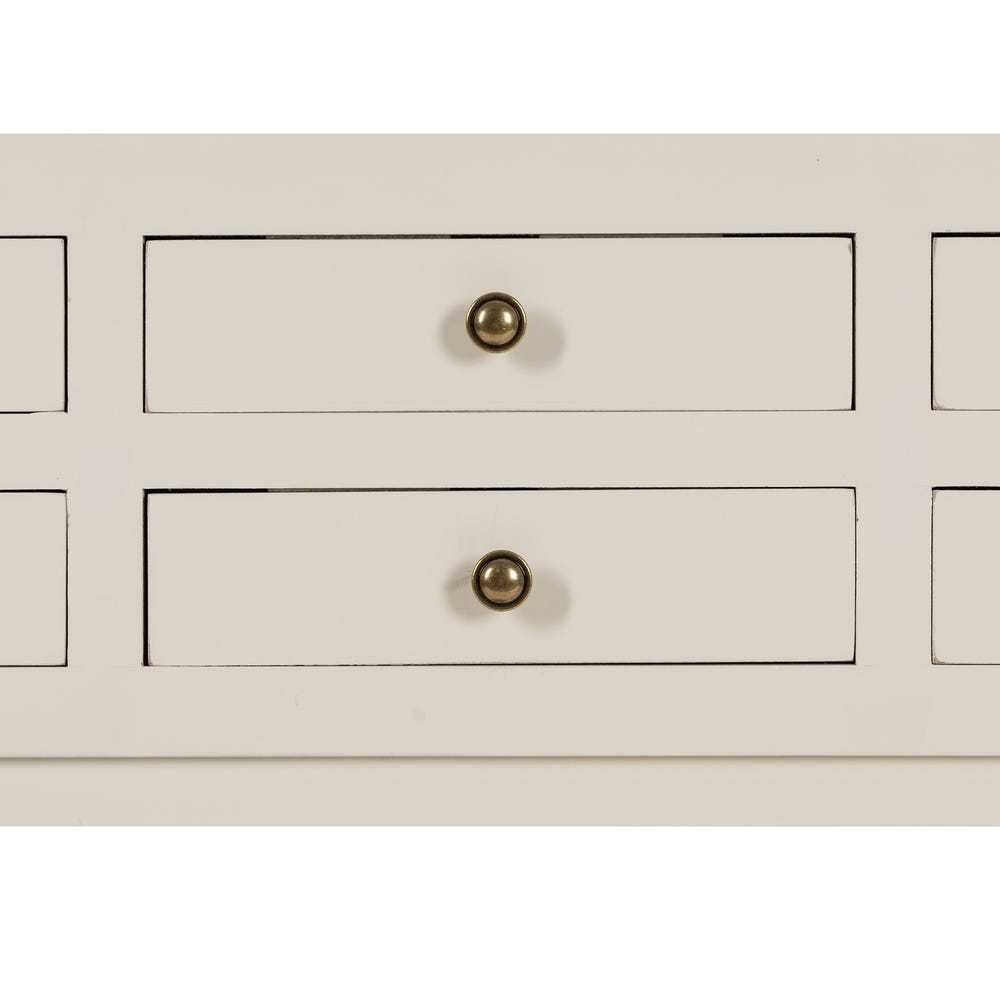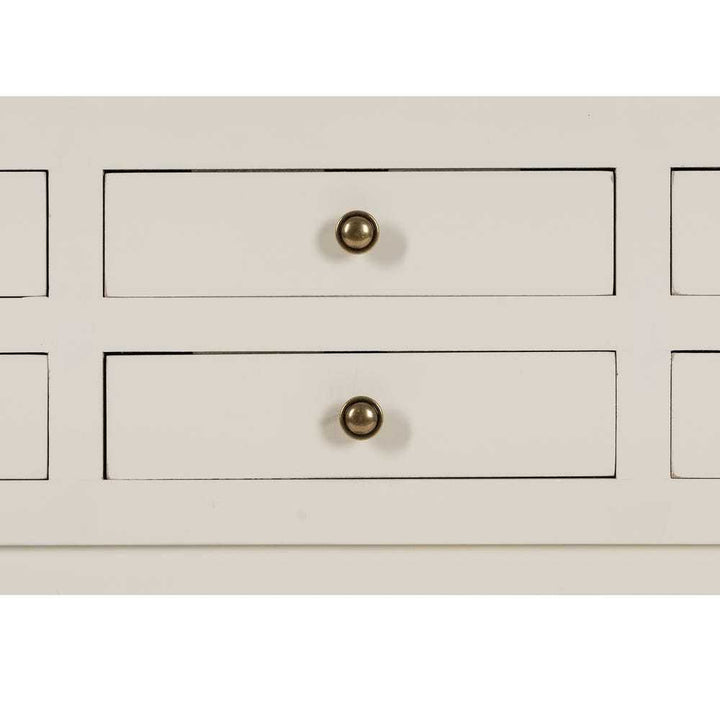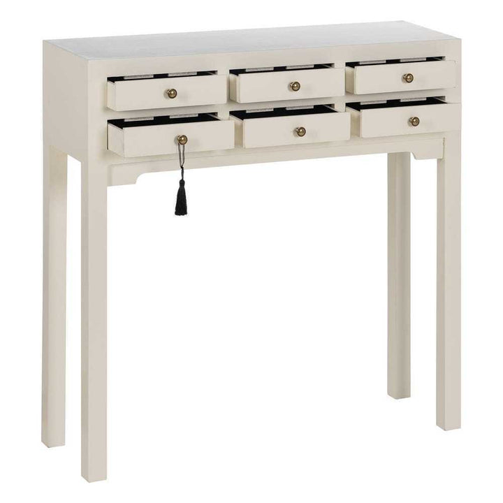 Lo stile di questa consolle può essere descritto come un mix contemporaneo che combina il minimalismo moderno con elementi tradizionali cinesi, il tutto con un tocco di estetica shabby chic. La palette di colori neutri, come il bianco, insieme ai dettagli dorati delle maniglie, dona un look sofisticato che si adatta sia a interni moderni sia a quelli più classici. Esplora l'equilibrio perfetto tra design minimalista e tradizione con questa consolle cinese bianca. Realizzata in legno di abete, la consolle è caratterizzata da una linea pulita e una finitura bianca che richiama il fascino dello shabby chic con un senso di freschezza moderna. Questo pezzo di arredamento dispone di sei cassetti, ognuno con le dimensioni di 24x24x6 cm, fornendo abbondante spazio per l'organizzazione e la conservazione degli oggetti quotidiani. Con le sue dimensioni di 85 cm di larghezza, 26 cm di profondità e 85 cm di altezza, la consolle si adatta con discrezione in qualsiasi spazio della casa. Le gambe in legno di abete, alte 60 cm, elevano la struttura garantendo stabilità e stile. Nessun assemblaggio è richiesto, permettendo di godere immediatamente della bellezza e funzionalità di questa consolle.