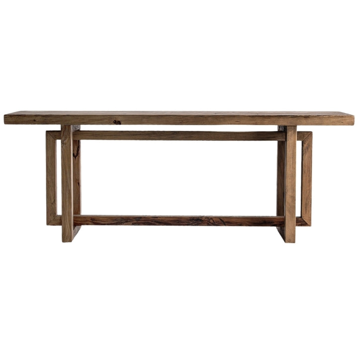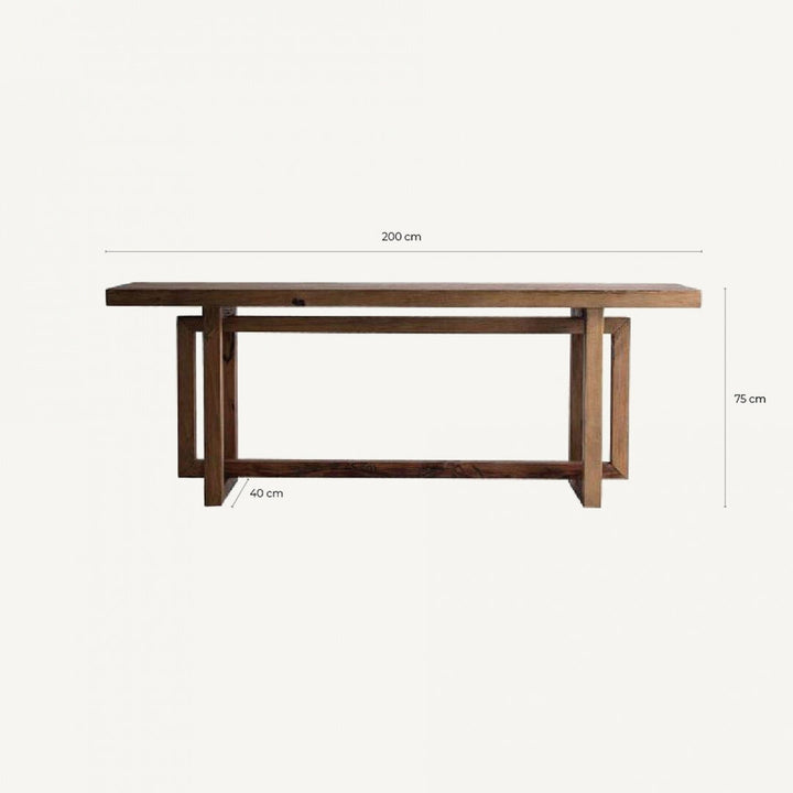 Il design chic contemporaneo si distingue per la sua semplicità raffinata e funzionale, rendendo questa consolle artigianale un'aggiunta versatile e sofisticata a qualsiasi ambiente. Realizzata in legno massello di pino riciclato, questa consolle è eco-sostenibile e valorizza la bellezza naturale delle venature del legno. Con dimensioni di 200 x 40 x 76 cm e un peso di 28,4 kg, offre stabilità e leggerezza, ideale per arredi contemporanei, come mobile ingresso o complemento per soggiorni moderni. Le gambe di 6 x 5 x 70 cm e lo spazio tra di esse (123 cm) garantiscono un design armonioso. Il piano spesso 6 cm supporta fino a 50 kg, perfetto per oggetti decorativi o accessori. Questo pezzo unico incarna l'arte artigianale, aggiungendo autenticità e fascino agli spazi moderni.
