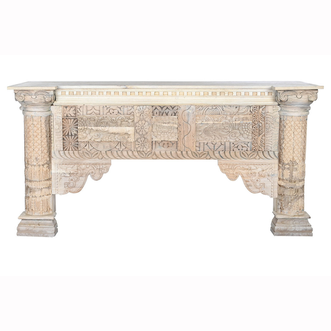 Questa magnifica consolle orientale indiana è un esempio eccezionale di artigianato tradizionale, realizzata interamente in legno massello di mango intarsiato. Con dimensioni di 180 x 55 cm e altezza di 90 cm, e un peso di 81 kg, questa consolle non è solo un pezzo d'arredo ma una vera e propria opera d'arte. Ogni dettaglio dell'intarsio racconta una storia, riflettendo la maestria degli artigiani che hanno lavorato minuziosamente per creare un design ricco e dettagliato. Le colonne robuste e le intricate decorazioni floreali e geometriche rendono ogni pezzo unico. Ideale per chi cerca consolle etniche scontate che offrano sia stile che funzionalità, questa consolle aggiunge un tocco di eleganza esotica e storica a qualsiasi ambiente, perfetta per l'ingresso o come punto focale in un soggiorno o sala da pranzo.