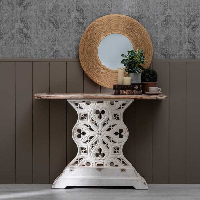 Consolle Provenzale Shabby Chic in Legno di Abete Intagliato Bianco con Piano Naturale Decapato - 120x40 cm