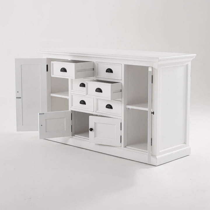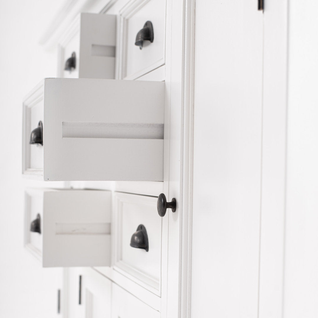 Dotata di 12 cassetti, 4 ante in vetro cristallo e 4 ante in legno, offre molteplici soluzioni di stoccaggio.
