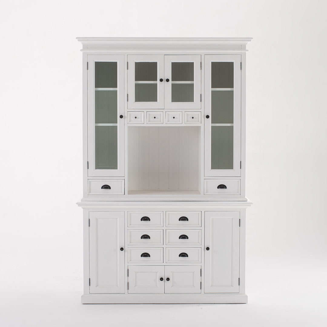 La sua struttura è suddivisa in una base con ante in legno e un'alzata con ante in vetro, mentre al centro un vano aperto offre ulteriori possibilità di organizzazione e decorazione.