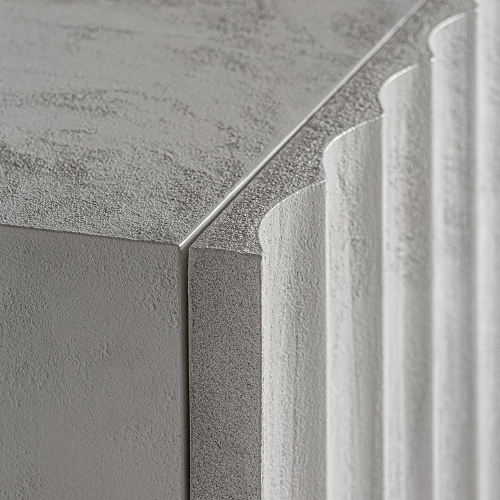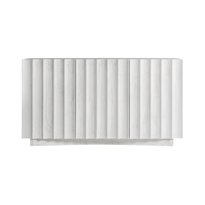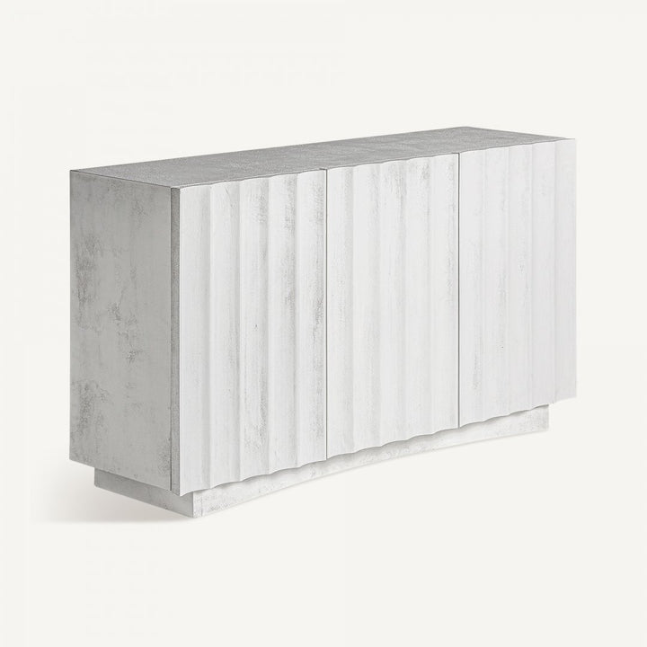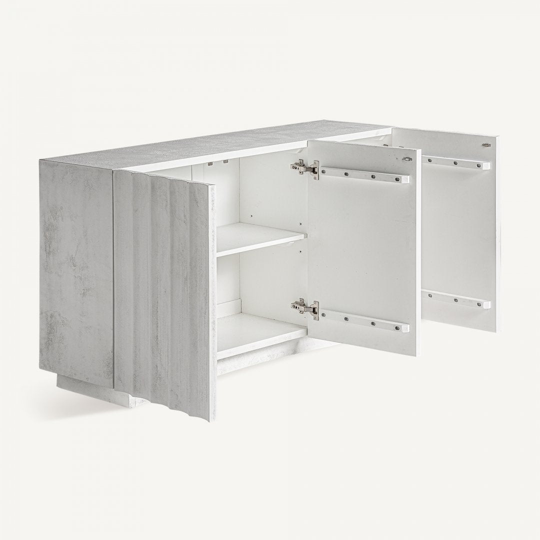 Questo buffet incarna il raffinato stile Deco Chic, caratterizzato da linee eleganti e design plissettato. La finitura bianca conferisce un aspetto pulito e sofisticato, ideale per interni moderni e contemporanei. Realizzato in resina combinata con cemento e legno DM, questo pezzo è progettato per combinare estetica e funzionalità. Con dimensioni di 140 x 40 x 76 cm e un peso di 68,3 kg, il buffet offre ampio spazio di archiviazione con tre porte e un ripiano interno regolabile. Le misure interne dei vani sono 40 x 33 x 63 cm e 82 x 33 x 63 cm, con un'altezza tra i ripiani di 30 cm e una capacità di carico di 15 kg per ripiano. Le gambe, alte 8 cm e dotate di tacchi regolabili, garantiscono stabilità e sicurezza. Questo buffet bianco è perfetto per soggiorni, sale da pranzo e ingressi, fungendo da punto focale grazie alla sua estetica distintiva e alla sua funzionalità. Include ancoraggio a parete per maggiore sicurezza e praticità nella pulizia con un semplice panno umido.