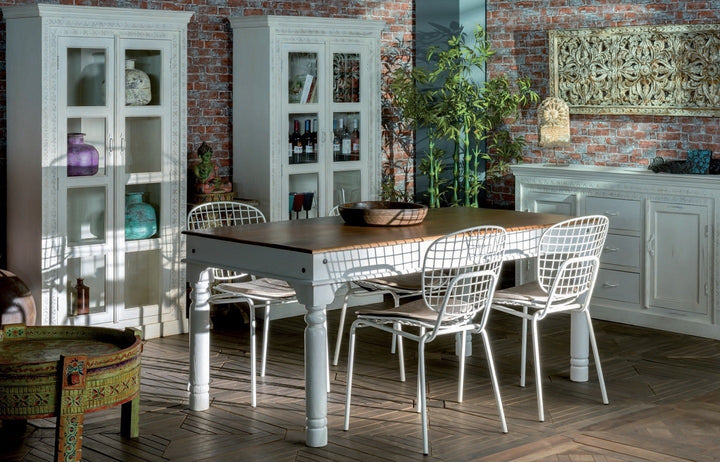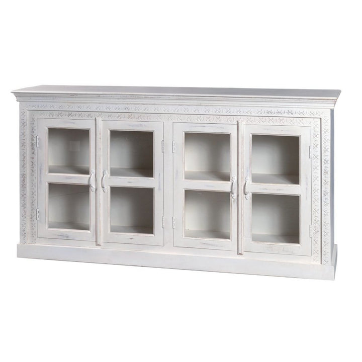 La credenza vetrina etnica bianca è un'elegante e raffinata aggiunta al tuo spazio. Realizzata con legno massello di mango nello stile shabby chic, questa credenza emana un fascino autentico e un carattere unico. Le dimensioni della credenza, 180 cm di lunghezza, 40 cm di larghezza e 100 cm di altezza, la rendono spaziosa e funzionale per conservare e esporre i tuoi oggetti preziosi. Le 4 ante con vetro itarsi artigianali aggiungono un tocco etnico e raffinato al design, permettendo di mostrare con orgoglio i tuoi articoli preferiti e di mantenerli al sicuro. La combinazione di materiali di alta qualità e un design artigianale dà vita a una credenza vetrina di eccellenza che si adatta a diversi ambienti e stili di arredamento. Acquista questa credenza vetrina etnica bianca per aggiungere un tocco di eleganza e un senso di avventura al tuo spazio abitativo. Trasforma il tuo ambiente in uno spazio accogliente e sofisticato con questa straordinaria credenza.