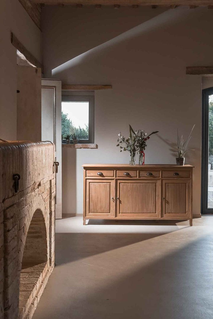 Il stile country chic si arricchisce con l'aggiunta della credenza in legno massello di teak naturale, lavorata artigianalmente per garantire unicità e qualità superiore. Dimensioni generose di L 180 x P 48 x H 95 cm, questa madia offre ampio spazio di stoccaggio con 3 ante e 4 cassetti, ideali per una casa ordinata e accogliente. La finitura a cera preserva le naturali caratteristiche estetiche del teak, esaltando il colore dorato e le venature con una ceratura manuale che sottolinea la bellezza intrinseca del legno. Per chi desidera un tocco più moderno, è disponibile la versione bianco decapé, realizzata con tecniche che mantengono le venature visibili e aggiungono luminosità agli spazi. Il supplemento del 20% per la variante decapata offre una scelta stilistica di grande impatto, perfetta per interni shabby chic ma adatta anche a contesti più classici e rustici. Questa credenza non è solo un pezzo di mobiliario, ma un'aggiunta di valore per ogni casa, testimoniando l'eleganza e la praticità del design artigianale.