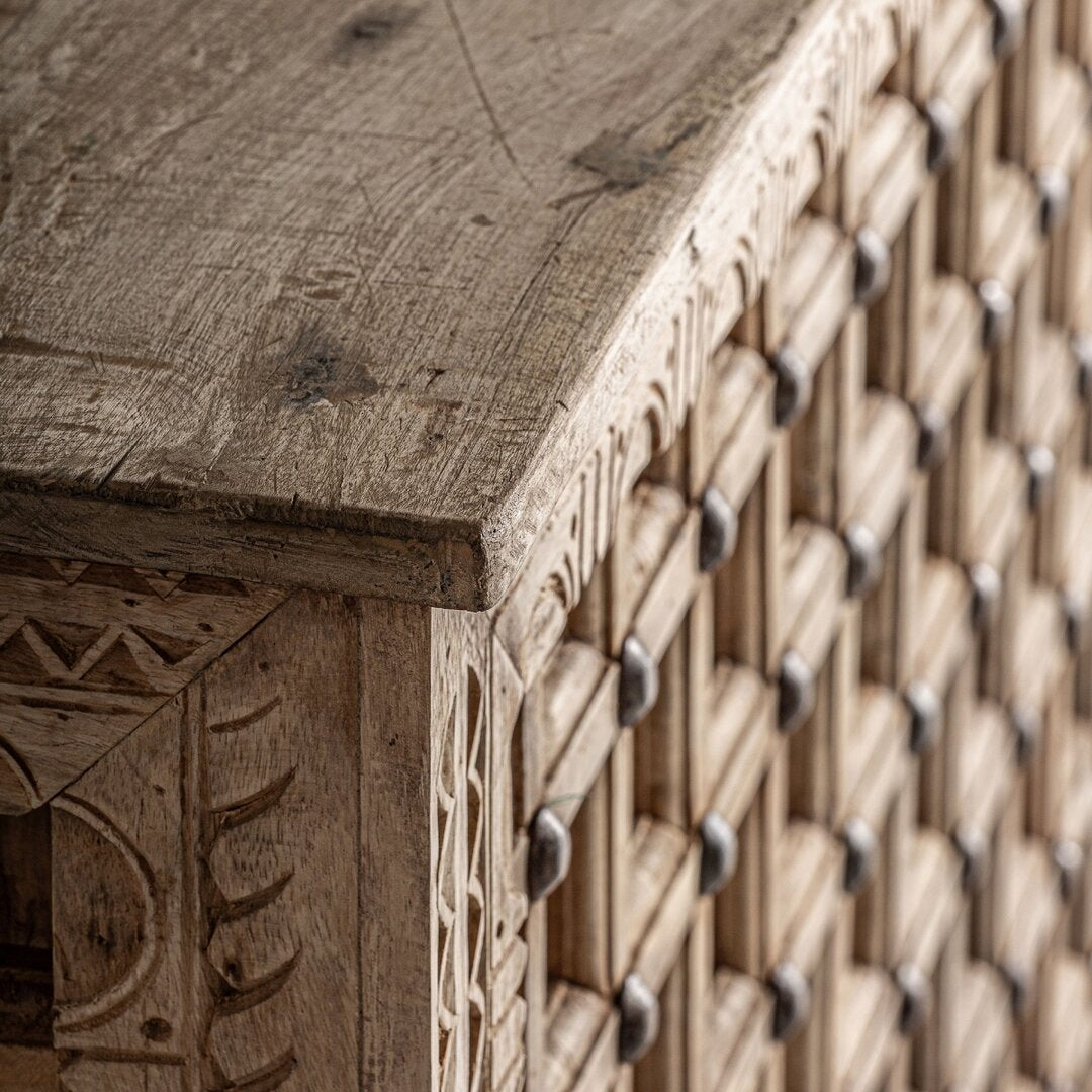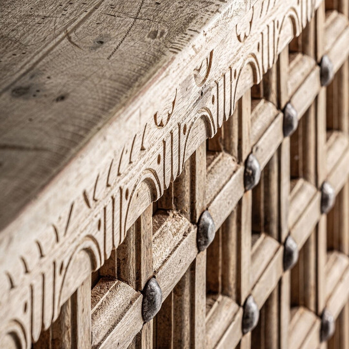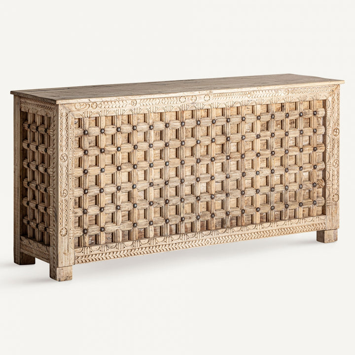Questa credenza rappresenta un autentico esempio di stile etnico, perfetto per chi desidera aggiungere un tocco di eleganza esotica alla propria casa. Realizzata interamente in legno massello di mango, è caratterizzata da dettagli intagliati a mano che richiamano la tradizione artigianale orientale. La tonalità marrone chiaro del legno si abbina facilmente a qualsiasi ambiente, rendendola ideale sia per soggiorni che per sale da pranzo dal gusto sofisticato. La struttura solida e la qualità dei materiali garantiscono durata e resistenza, mentre le dimensioni generose offrono uno spazio funzionale per organizzare e riporre oggetti. Questa credenza intagliata è una combinazione perfetta di praticità e design, aggiungendo un’atmosfera calda e accogliente alla tua casa.