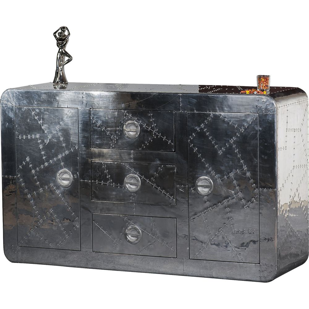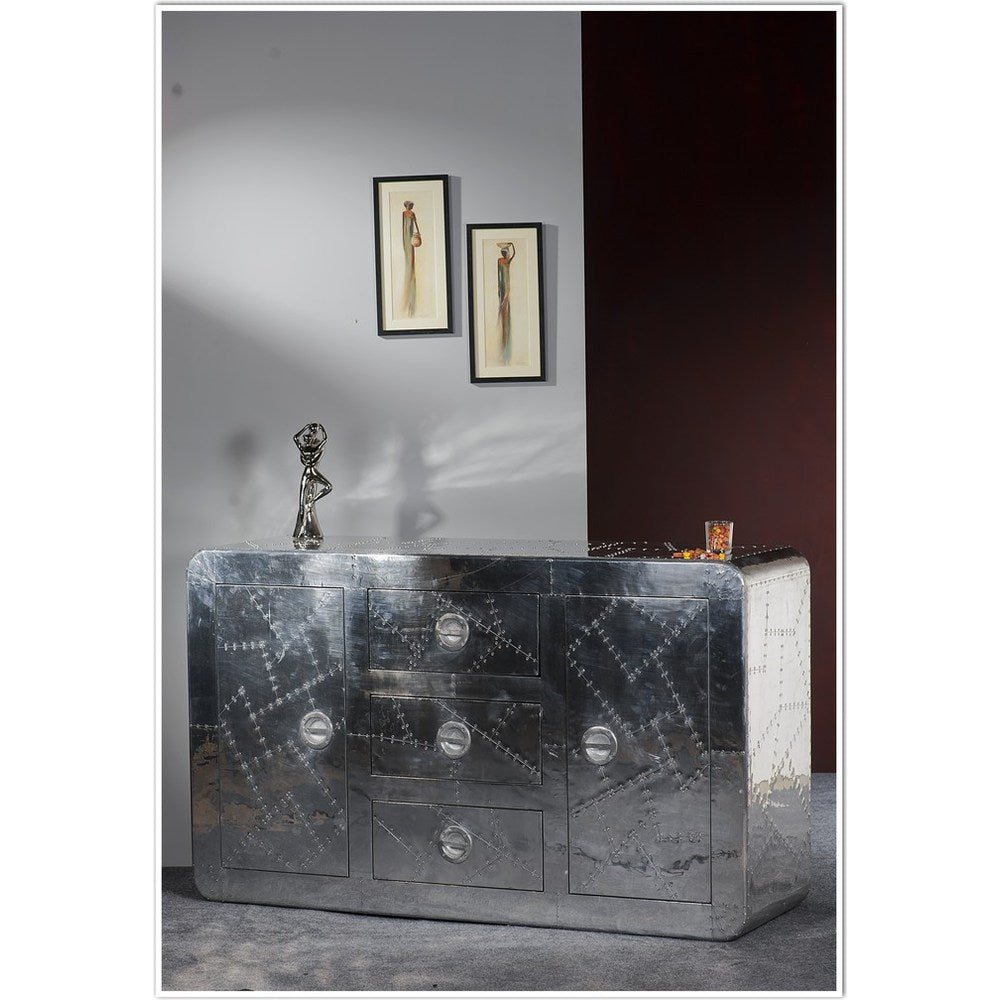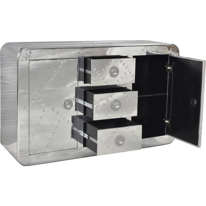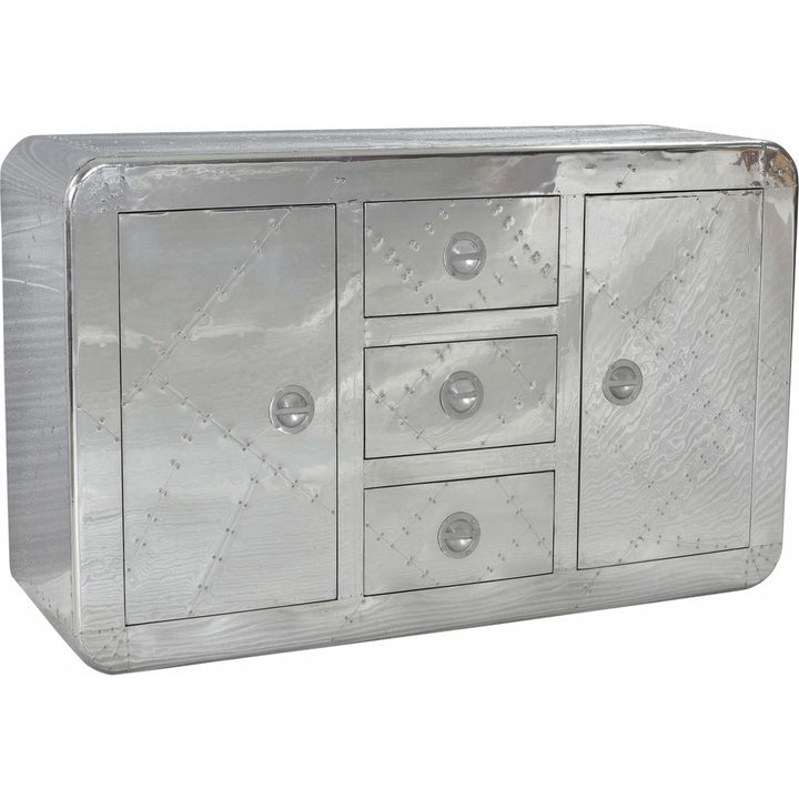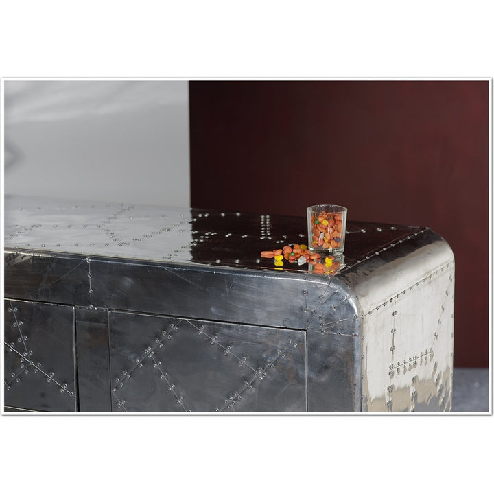 Lo stile aeronautico trasforma il living in una cabina di comando futuristica. La Credenza Vintage 2 Ante Alluminio è realizzata in mango + MDF rivestito in alluminio specchio, con viti decorative a vista. Con peso di 63 kg, presenta 2 ante battenti, 3 cassetti scorrevoli e ripiani interni profondi 38 cm. Ogni riflesso è unico. Perfetta per soggiorni hi-tech e cucine metropolitane, amplifica la luce e l’ordine. Proposta con sconti fino al 70% su Ethnic Chic.
