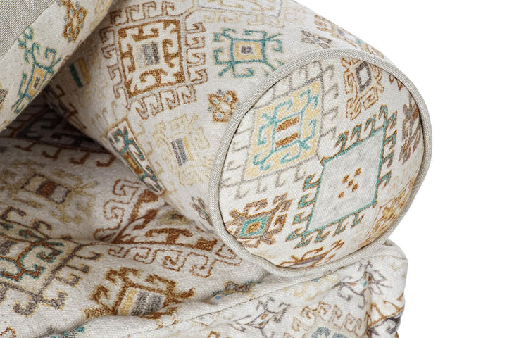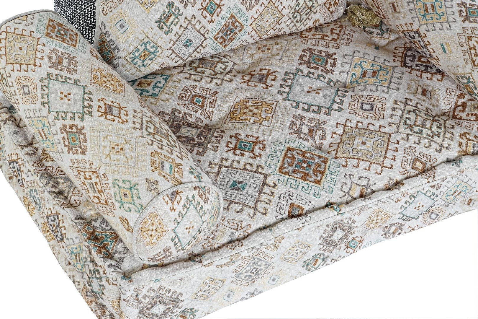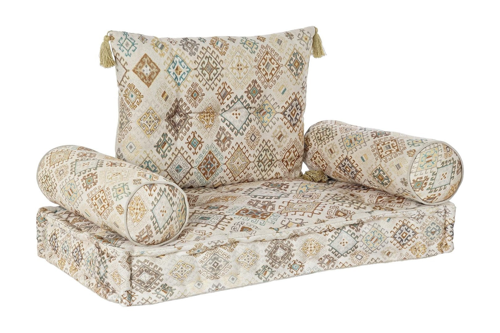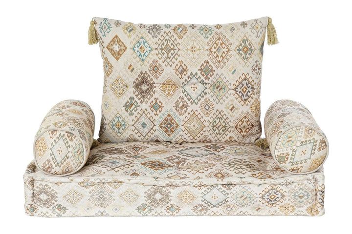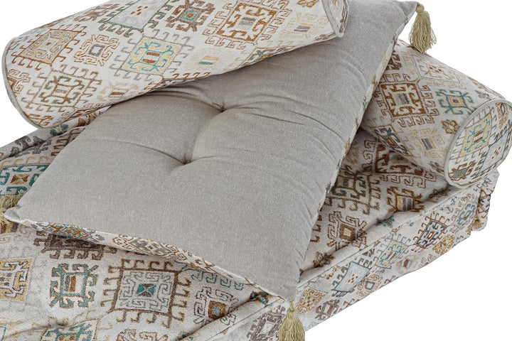 Lostile bohemian o boho-chic, è riconoscibile per i suoi motivi intricati e colorati, che spesso includono disegni geometrici, floral e tribali. La combinazione di vari motivi e una palette di colori neutri e terra con accenti più vivaci è tipica del bohemian chic, che trae ispirazione da una varietà di influenze culturali e si propone di creare un ambiente rilassato e accogliente. Questo set di 4 cuscini per poltrona è realizzato in cotone ticamato beige consumato, offrendo una combinazione di comfort e stile unico. Con dimensioni di 90x50 cm e altezza variabile tra 13 (seduta) e 65 cm, e un peso di 17 kg, questi cuscini offrono non solo un supporto eccellente ma anche un'impressionante presenza visiva. La palette di colori neutri e terra, arricchita da accenti più vivaci, crea un ambiente accogliente e rilassato, perfetto per chi cerca di riflettere una varietà di influenze culturali nel proprio arredo. Ideali per l'uso su divani o come materassi per pedane, questi cuscini sono progettati per trasformare qualsiasi spazio in un'oasi di comfort boho chic.