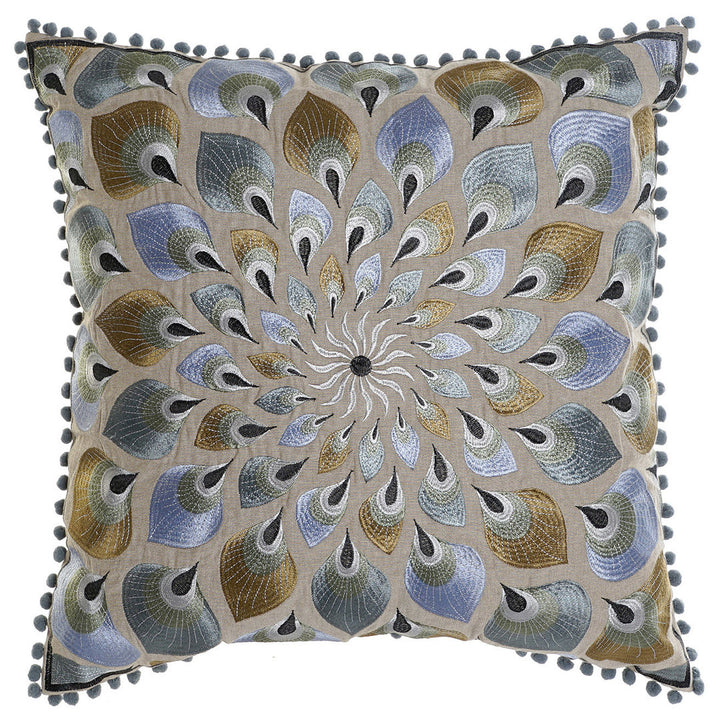 Una vera opera d'arte tessile che combina l'eleganza del cotone ricamato celeste e beige con un intricato design floreale. Questo cuscino presenta un motivo centrale che ricorda una mandala, con petali stilizzati che si irraggiano in una varietà di tonalità raffinate, da toni di blu a sfumature dorate, circondati da una serie di pompon decorativi che aggiungono un tocco giocoso e distintivo. Misurando 60x60 cm con un'altezza di 20 cm e pesando 1,10 kg, questo cuscino non solo aggiunge un elemento di comfort eccezionale ma anche un accento visivo spettacolare a qualsiasi ambiente. Ideale per chi cerca di infondere un senso di calore e stile artistico nel proprio spazio, è perfetto per completare un arredo boho chic e disponibile per l'acquisto online.