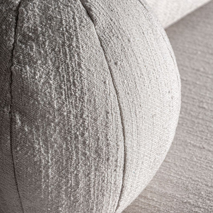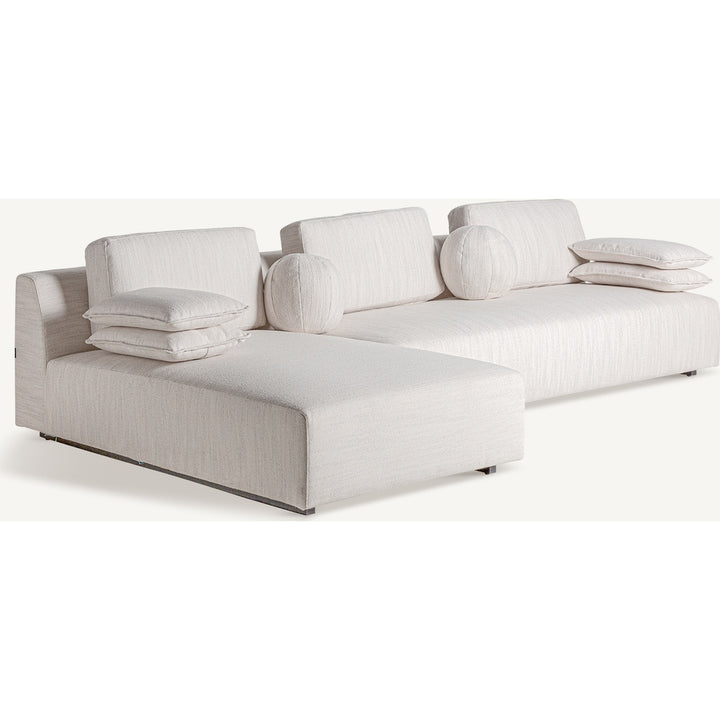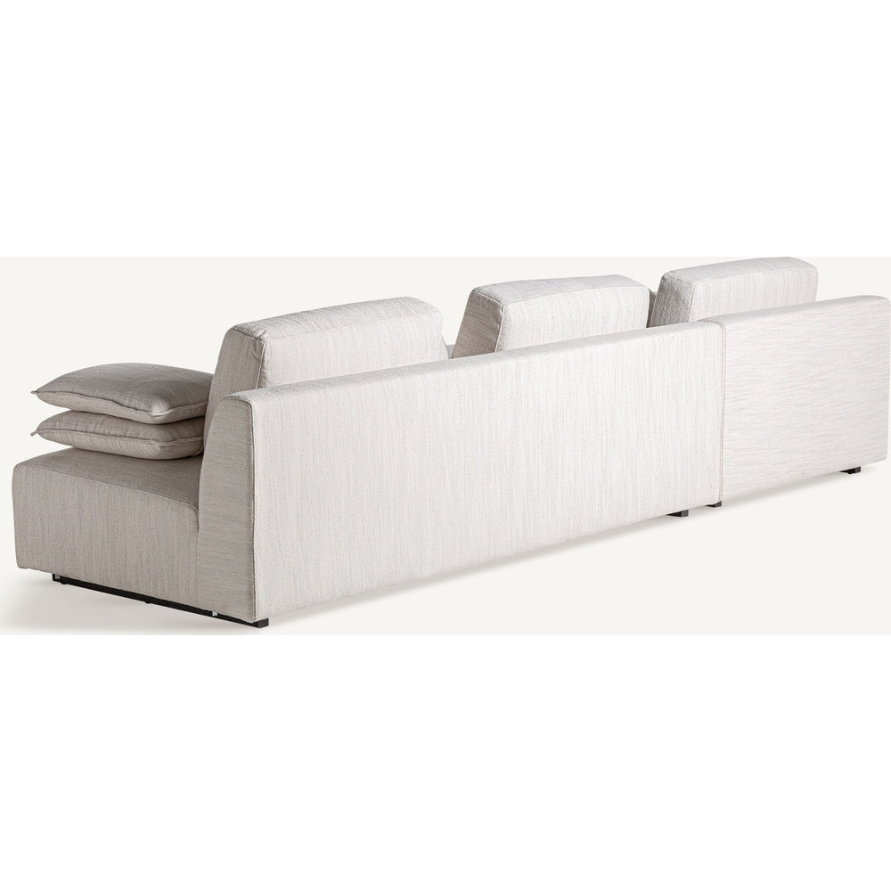 NOTE: Struttura in pino, caucciù e MDF, rivestimento poliestere bianco sporco, chaise longue integrata, cuscini sfoderabili, 4 posti, portata 320 kg, design elegante e moderno.