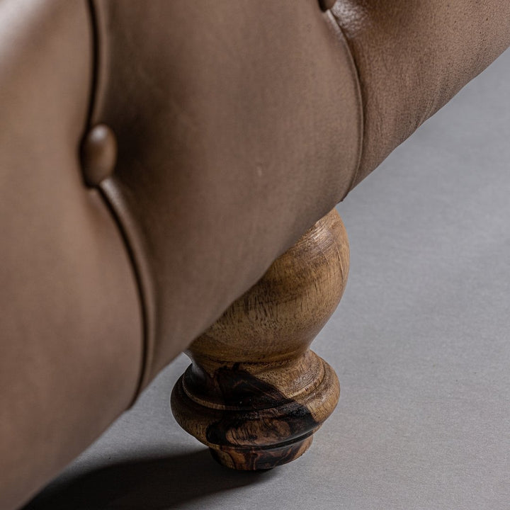 Il nostro Sofà Capitonné Marrone è un capolavoro di design vintage con il suo elegante capitonné e il ricco colore marrone. La combinazione di pelle pregiata e solido legno di pino aggiunge un tocco di calore e durabilità.