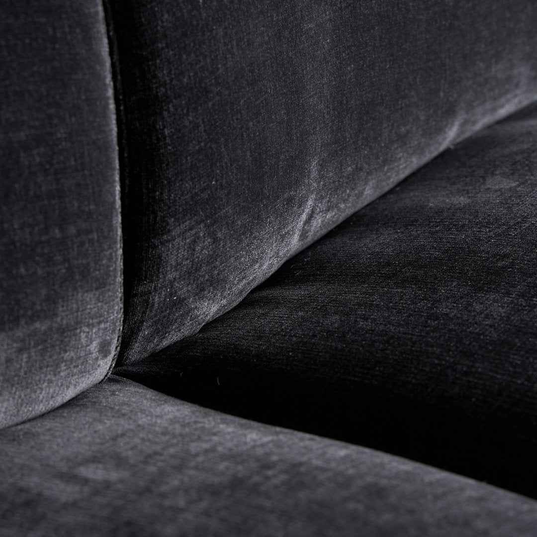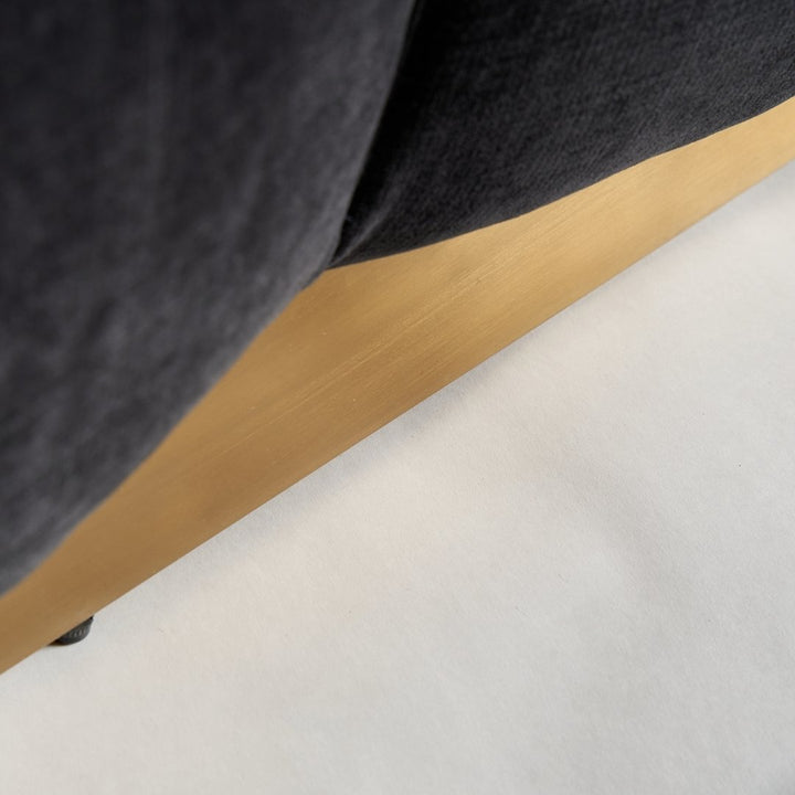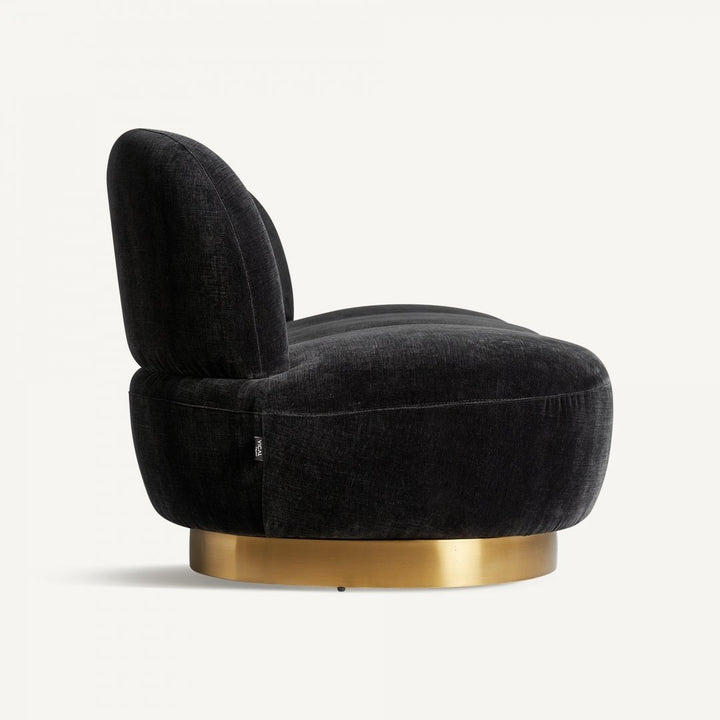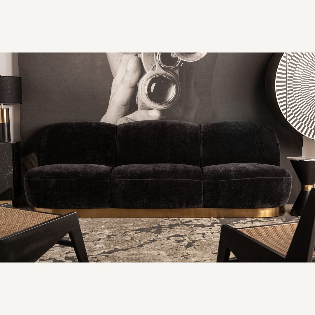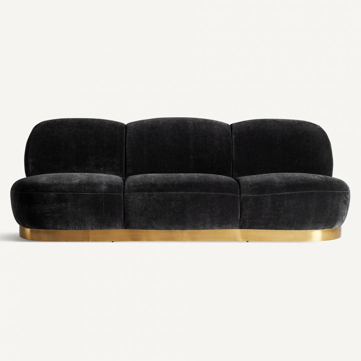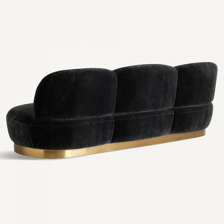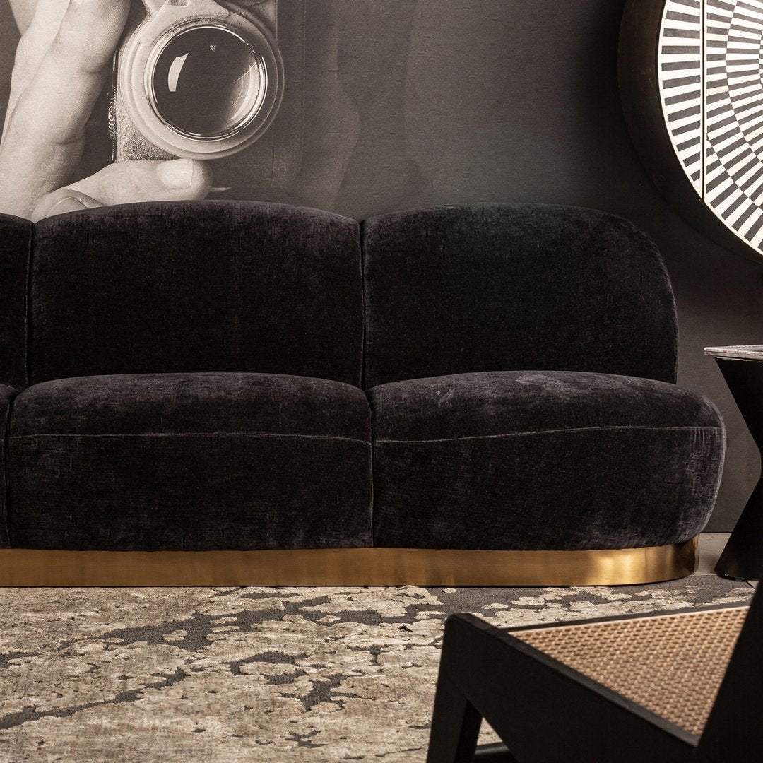 Il sofà è un'elegante creazione realizzata in terciopelo nero di alta qualità abbinato all'acciaio dorato per un tocco di lusso. La fusione di questi materiali nobili cattura l'essenza dell'art déco e aggiunge un tocco di classe al tuo spazio.
