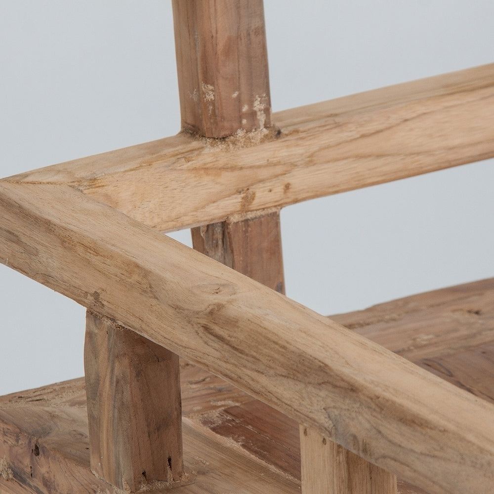Il divano è realizzato in legno massello di teak naturale, un materiale pregiato noto per la sua bellezza, resistenza e durata nel tempo.