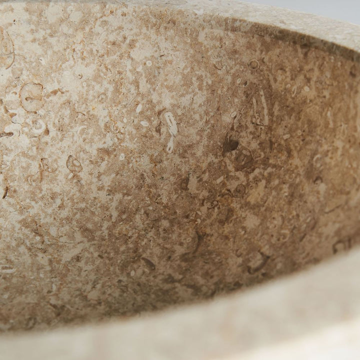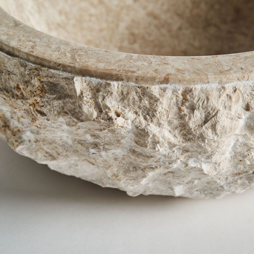 NOTE: Marmo naturale color crema; profondità interna 120 mm; foro scarico 40 mm; peso 27 kg; realizzazione artigianale; ogni lavabo è unico; rubinetto non incluso.
