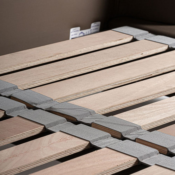 Materiali pelle marrone, legno di pino e schiuma