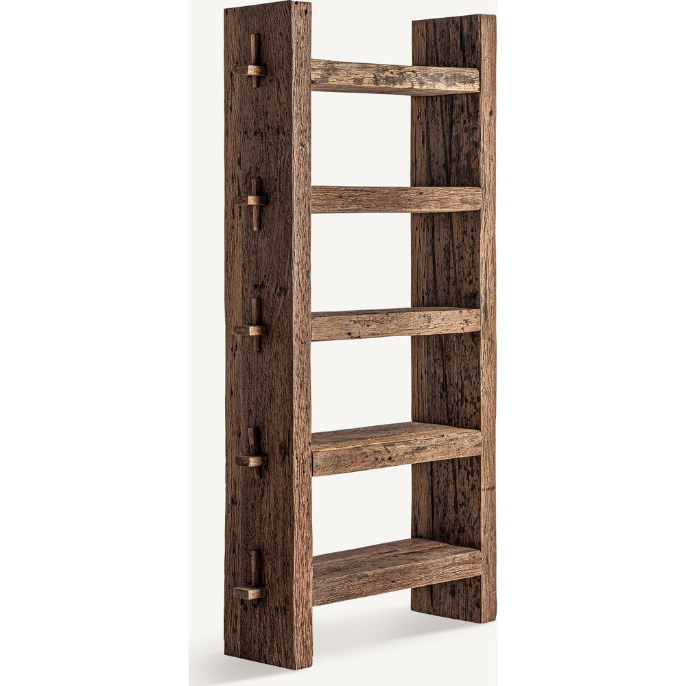 NOTE: Legno massello di mango e recupero, cinque ripiani fissi, portata 10 kg per ripiano, struttura smontabile, finitura naturale calda, peso 88,2 kg.