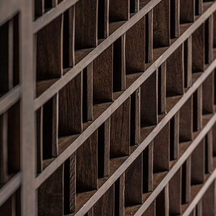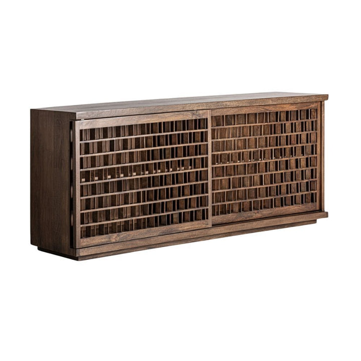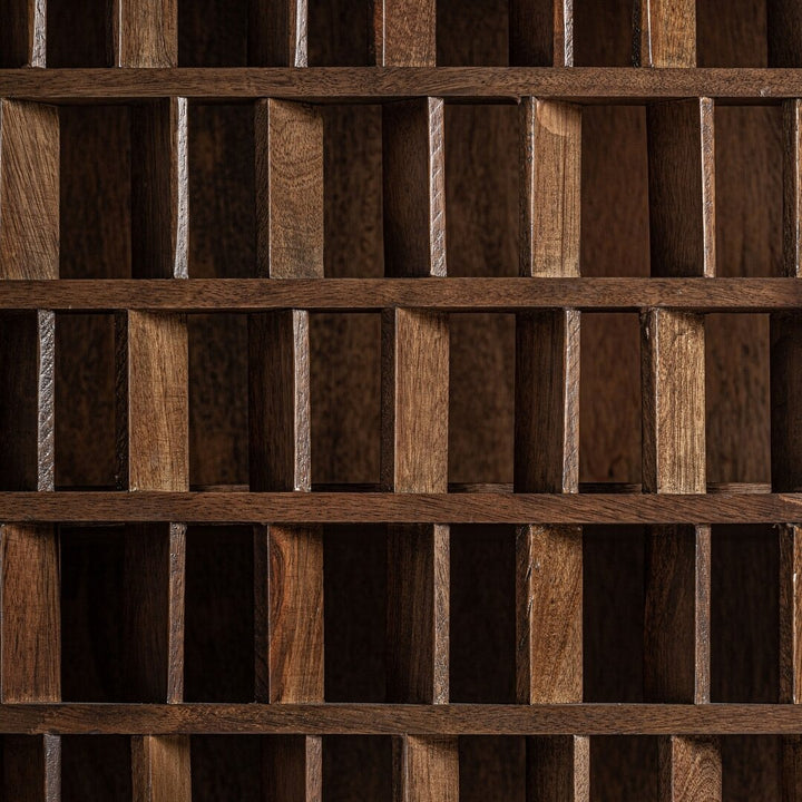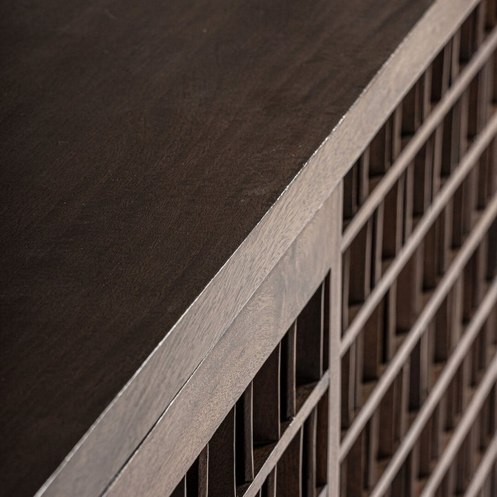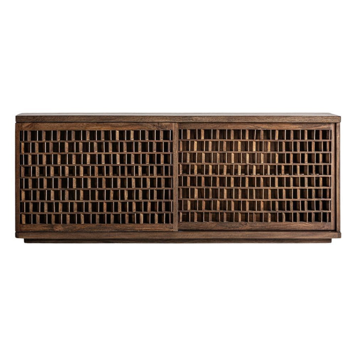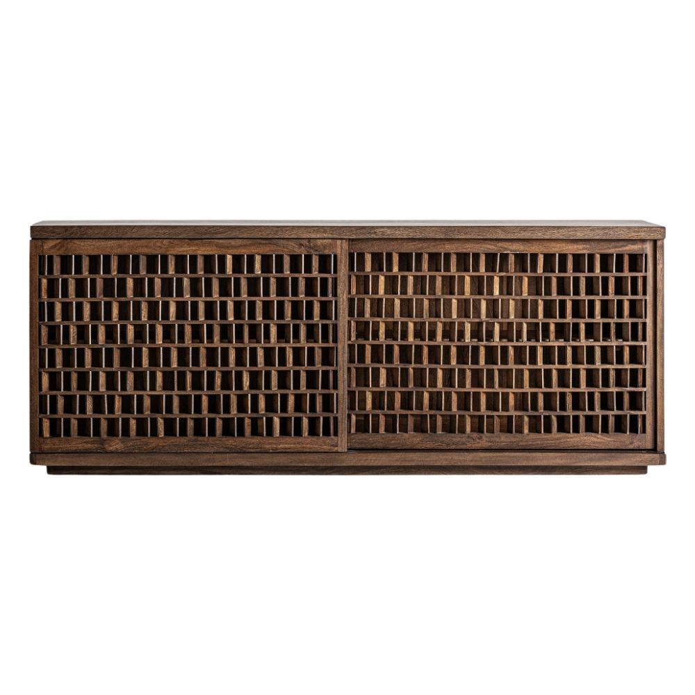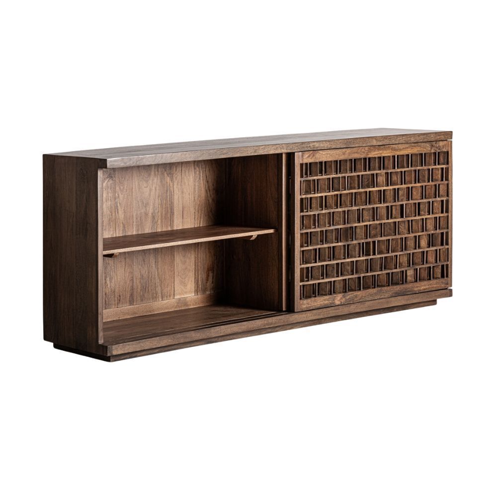Realizzata in legno di mango marrone, si distingue per le sue ante con griglia decorativa, che donano leggerezza e carattere alla struttura. Perfetta per soggiorni o sale da pranzo, offre ampio spazio per riporre oggetti e utensili. Con un peso di 91,5 kg, questa credenza artigianale è unica nel suo genere, grazie alle naturali variazioni del legno che ne esaltano l’autenticità.