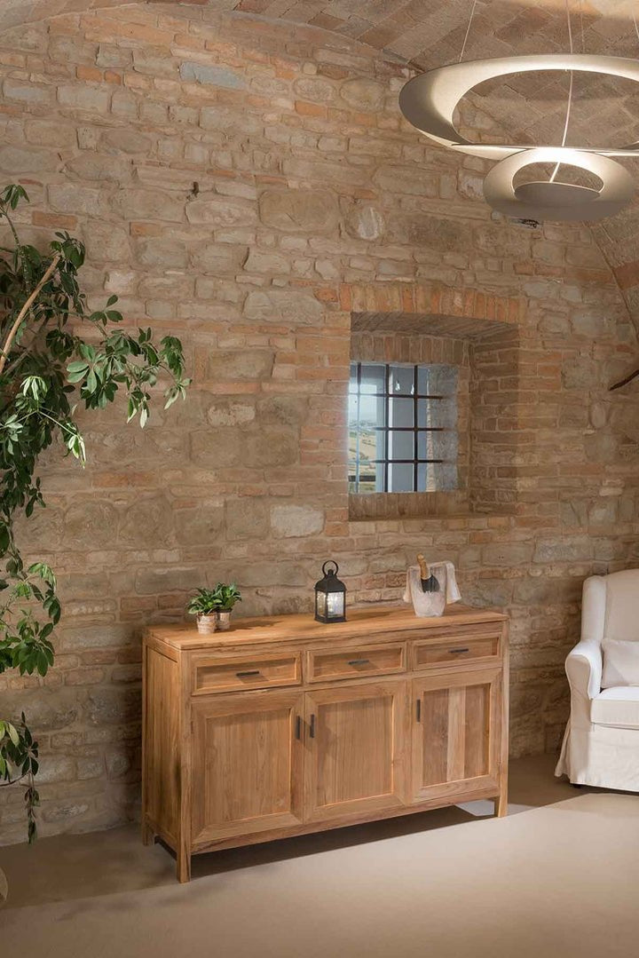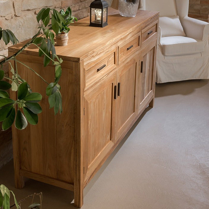 Il buffet in stile country chic rappresenta una scelta perfetta per chi desidera unire estetica e funzionalità in interni di stile classico, rustico, etnico o shabby chic. Realizzato artigianalmente in legno massello di teak naturale, questo mobile misura L 155 x P 45 x H 90 cm e offre un ampio spazio di stoccaggio con 3 ante e 3 cassetti, oltre a un ripiano interno posizionato a mezz'altezza, ideale per mantenere l'ordine e l'eleganza. La finitura a cera preserva le qualità estetiche e funzionali del teak, un legno pregiato noto per la sua resistenza e la capacità di auto-lubrificazione. La versione bianco decapé, con un supplemento del 20%, è trattata con tecniche manuali per mantenere le venature visibili, offrendo un'opzione più luminosa e fresca per gli ambienti. Le maniglie in ottone anticato aggiungono un tocco di eleganza raffinata, rendendo questo buffet non solo un pezzo di mobiliario, ma una vera espressione di stile e qualità artigianale.