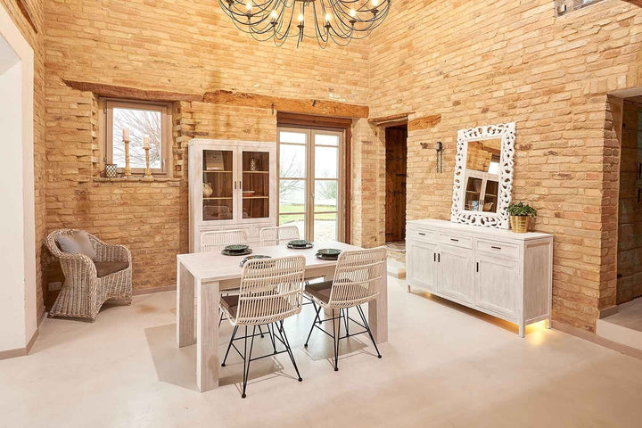 Il buffet in stile country chic si distingue per il suo design che combina la bellezza rustica con una finitura moderna e luminosa, perfetto per interni dal gusto classico, rustico, etnico o shabby chic. Questa versione in teak sbiancato, realizzata artigianalmente, misura L 155 x P 45 x H 90 cm e offre una capacità di stoccaggio ideale con 3 ante e 3 cassetti, oltre a un pratico ripiano interno. La finitura sbiancata, ottenuta attraverso un processo manuale che preserva le venature del legno, conferisce al mobile un aspetto fresco e accogliente, mentre le maniglie in ottone anticato arricchiscono il pezzo di un tocco di eleganza senza tempo. Questo buffet non solo ottimizza gli spazi, ma diventa una vera e propria dichiarazione di stile nell'arredo domestico, unendo funzionalità ed estetica in modo impeccabile.