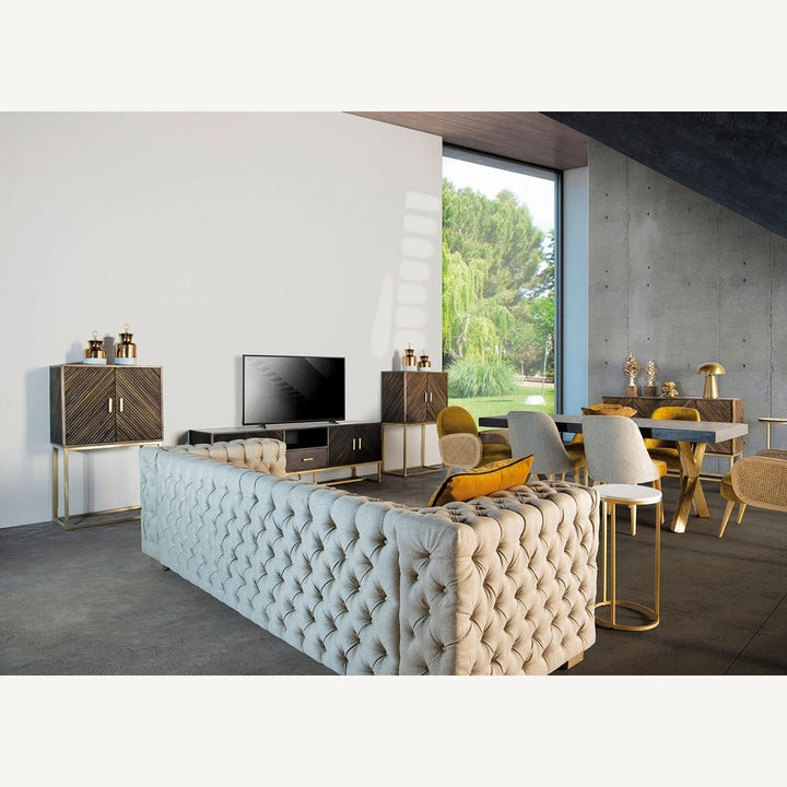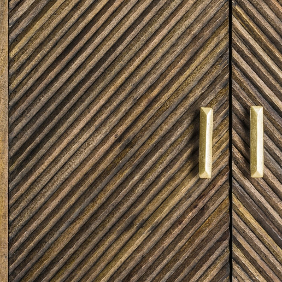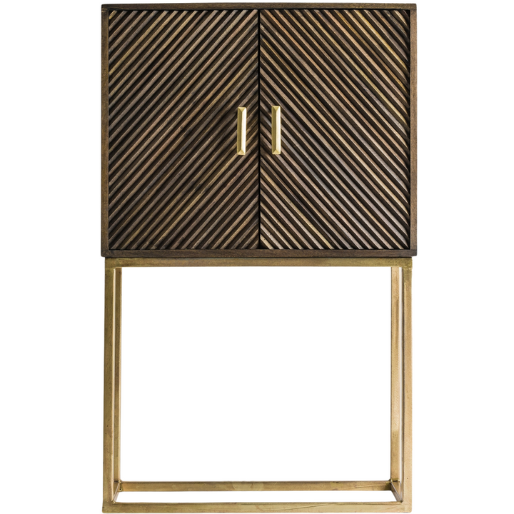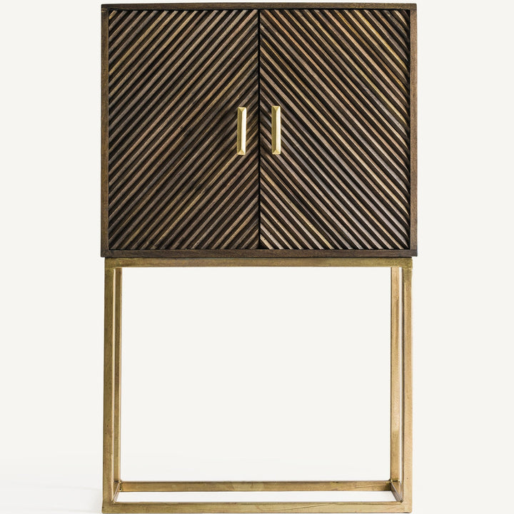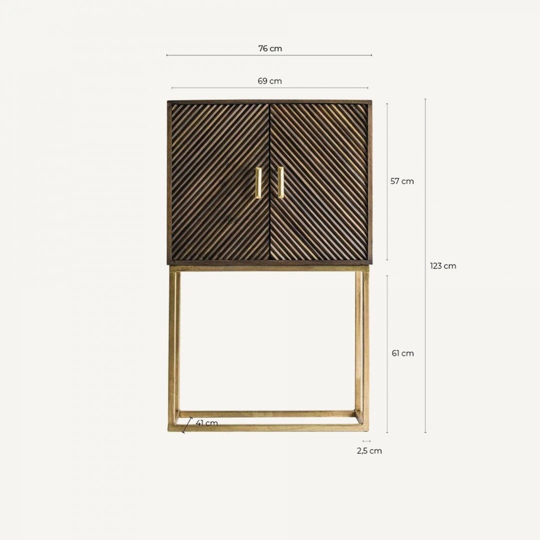 Un elegante mix di stile vintage e design industriale, questo mobile bar in legno massello di mango e ferro dorato aggiunge un tocco di lusso a qualsiasi ambiente. Con due porte e una mensola interna fissa, offre un ampio spazio per organizzare bevande e accessori da bar. La struttura robusta può supportare fino a 70 kg, mentre i tacchi regolabili delle gambe garantiscono stabilità su ogni superficie. Perfetto per chi desidera un angolo bar funzionale e di classe, questo mobile valorizza il tuo spazio con un’estetica contemporanea che fonde eleganza e praticità.