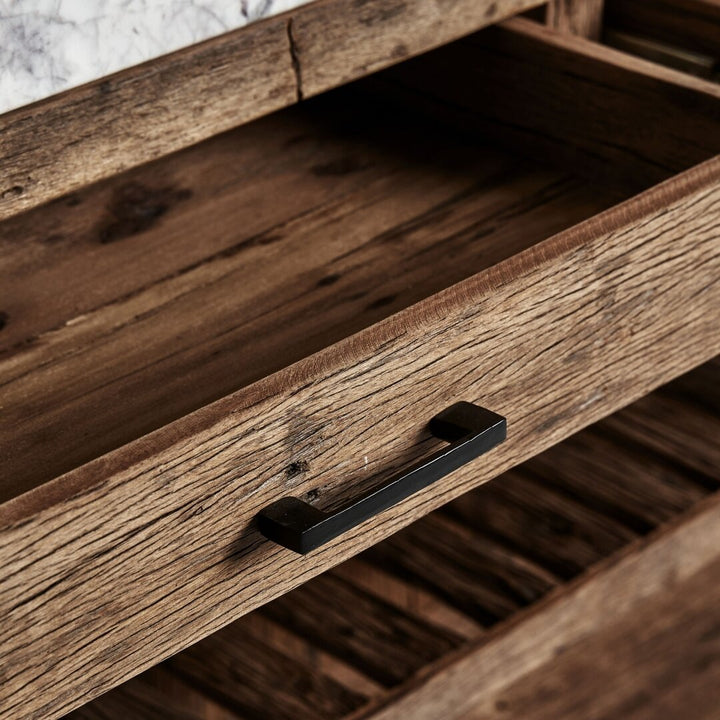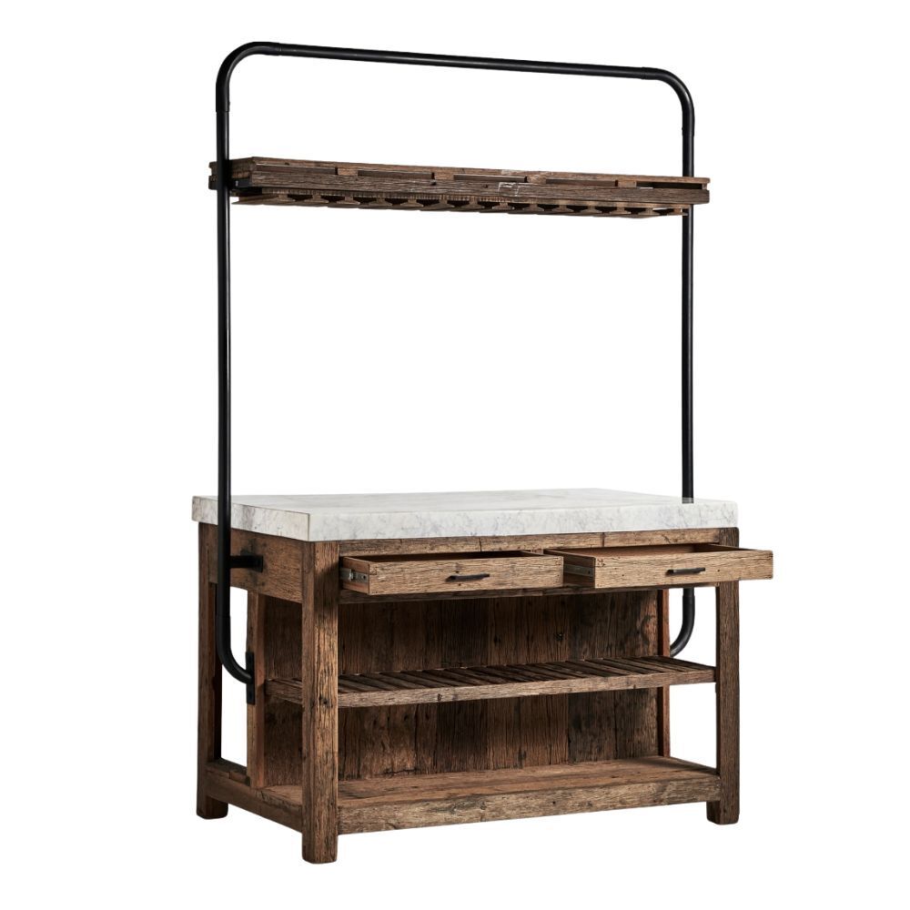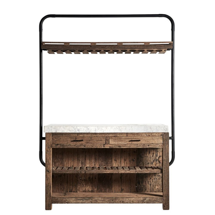 Dal carattere deciso e dallo stile industriale, questo mobile bar unisce il fascino del legno riciclato con la solidità del ferro e l’eleganza del marmo. Perfetto per ambienti dal design moderno e vintage, è ideale per bistrot, locali commerciali e spazi dal gusto loft.