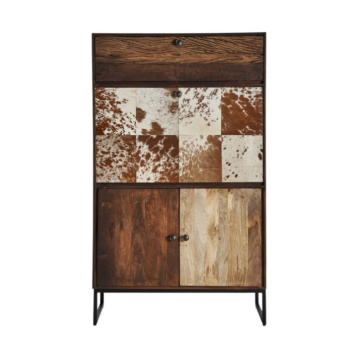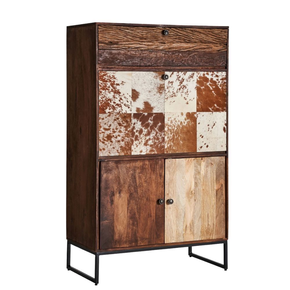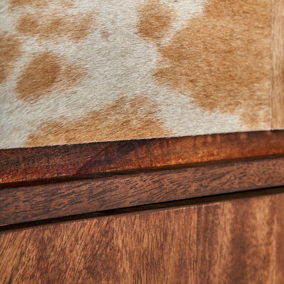 Realizzato in legno di mango riciclato marrone, è arricchito da dettagli in ferro battuto nero e inserti in pelle bovina nei toni del marrone, che ne esaltano lo stile texano. Il piano a ribalta offre una pratica superficie d’appoggio per la preparazione di drink, mentre la parte inferiore è dotata di ante e ripiani interni per riporre bottiglie, bicchieri e accessori da bar. Il design robusto e la lavorazione artigianale rendono ogni pezzo unico, con leggere variazioni di tonalità e segni naturali del materiale che ne valorizzano l’autenticità. Un complemento perfetto per creare un angolo bar esclusivo e raffinato.