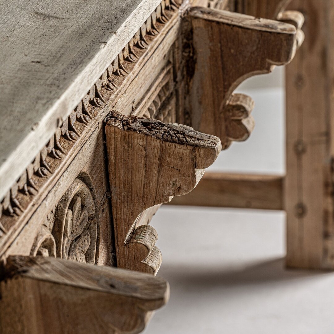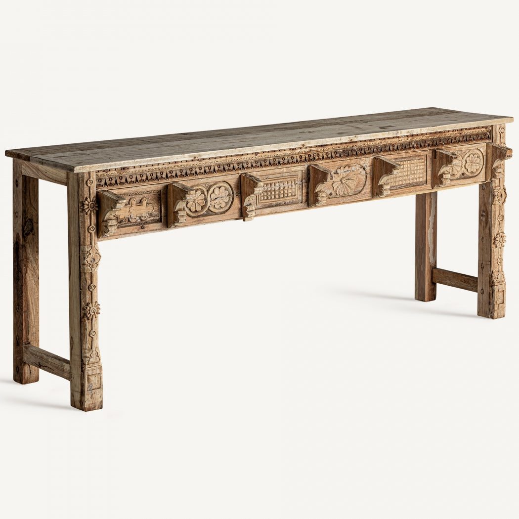 Lo stile etnico decapato unisce autenticità e fascino rustico, perfetto per chi desidera arredare i propri spazi con mobili che raccontano una storia unica. Questa consolle artigianale, realizzata in legno massello di mango, incarna la bellezza del design etnico con una finitura marrone invecchiata che esalta le venature naturali del legno. Le dimensioni di 162 x 51 x 76 cm, un peso di 32,5 kg e uno spessore del piano di 2 cm garantiscono robustezza e funzionalità. Le gambe di 6 x 6 x 7,5 cm, con uno spazio tra esse di 143 cm, offrono equilibrio strutturale. Ideale come mobile ingresso, consolle soggiorno o complemento d'arredo etnico, è un pezzo unico che porta con sé un mix di tradizione e stile contemporaneo, perfetto per valorizzare ogni ambiente.