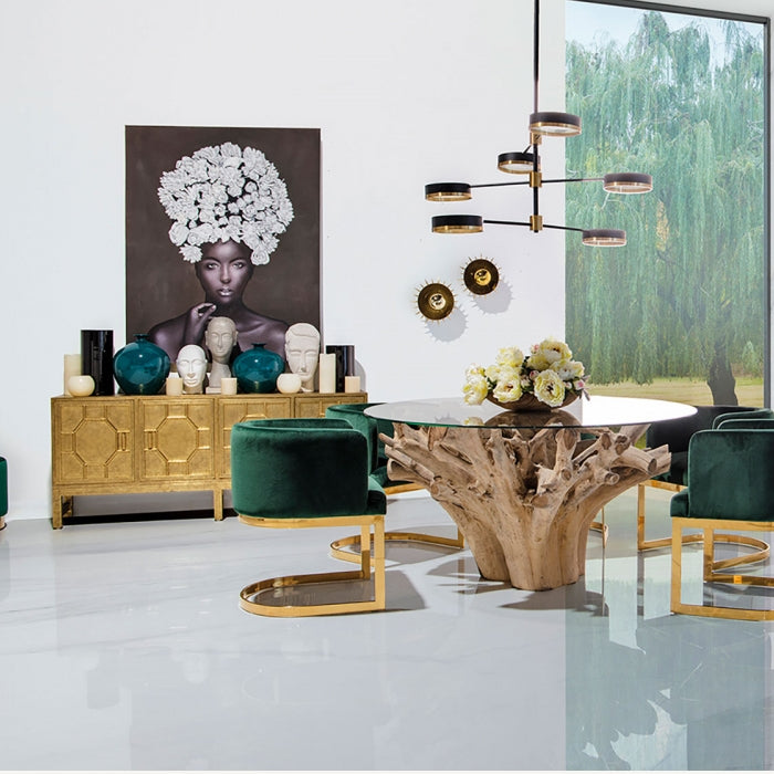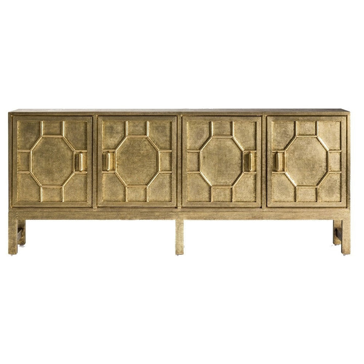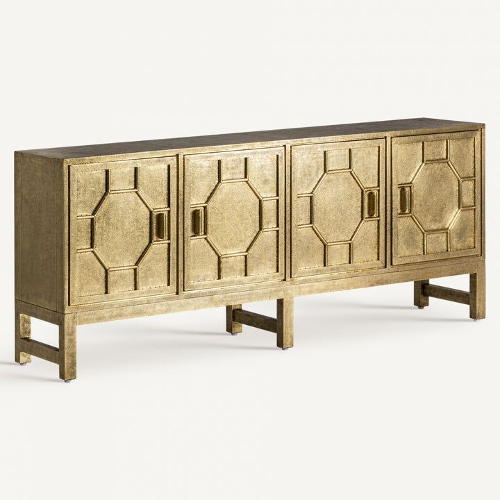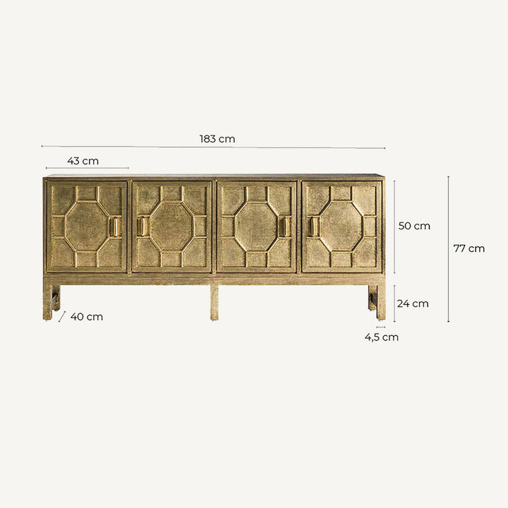 Immergiti nel lusso con il nostro Buffet in Ottone Goffrato, un pezzo che porta distinzione e stile in ogni ambiente. Realizzato con ottone goffrato e legno MDF, questo mobile si distingue per la sua finitura in oro antico e un design intricato che cattura lo sguardo. Di dimensioni 183 x 40 x 77 cm e un peso di 60,4 kg, il nostro buffet offre non solo una presenza di grande impatto ma anche una solida funzionalità. Con 4 porte e un'ampia superficie di supporto che può reggere fino a 80 kg, è ideale per soggiorni e sale da pranzo eleganti. Le gambe robuste (4.5X4.5X19 cm) garantiscono stabilità, mentre l'assenza di ripiani interni offre un ampio spazio per qualsiasi utilizzo. Questo buffet non è solo un mobile ma un vero investimento in eleganza e durata.