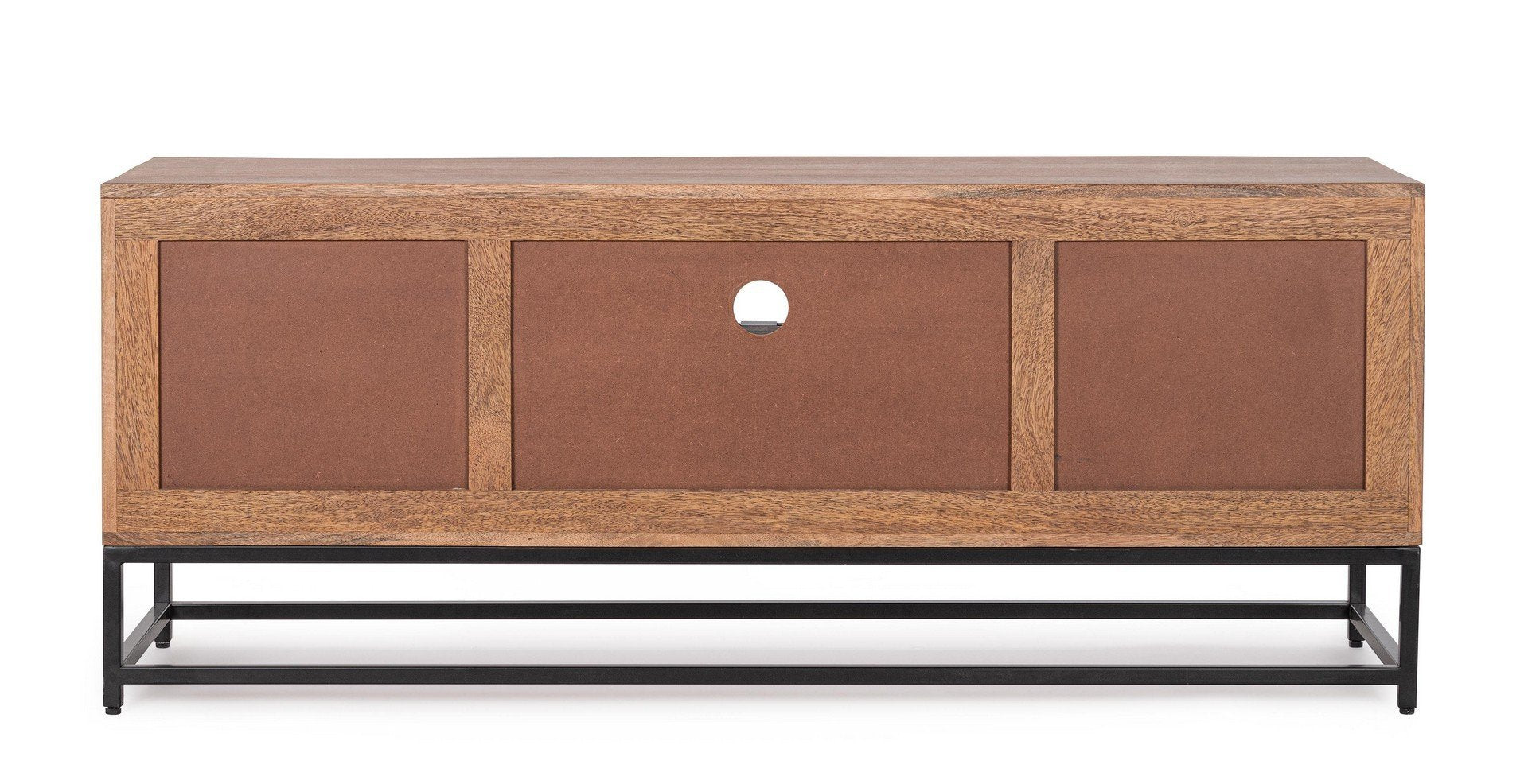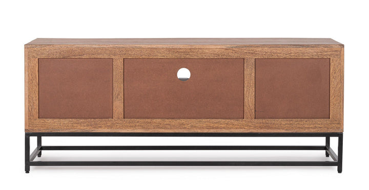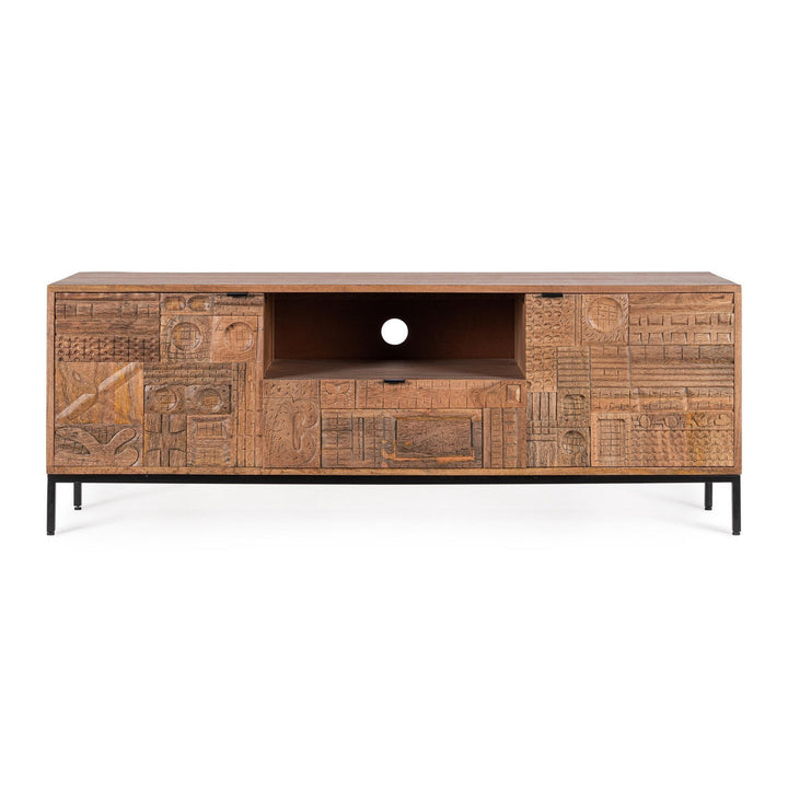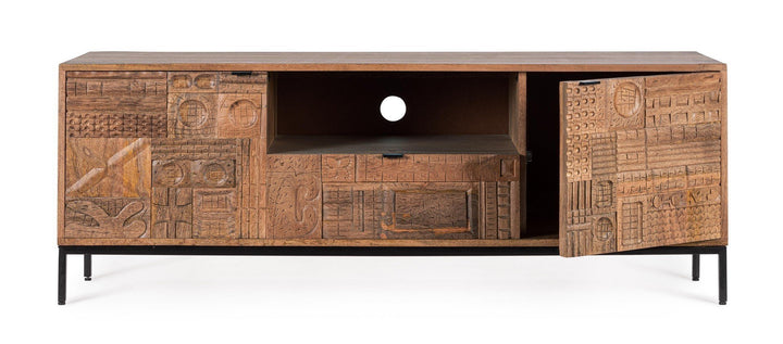 Il vano porta è dotato di una pratica mensola interna, ideale per organizzare i tuoi dispositivi e accessori elettronici. Questo mobile porta TV si distingue per la sua autenticità artigianale, perfetto per arredare soggiorni in stile boho chic o etnico contemporaneo.